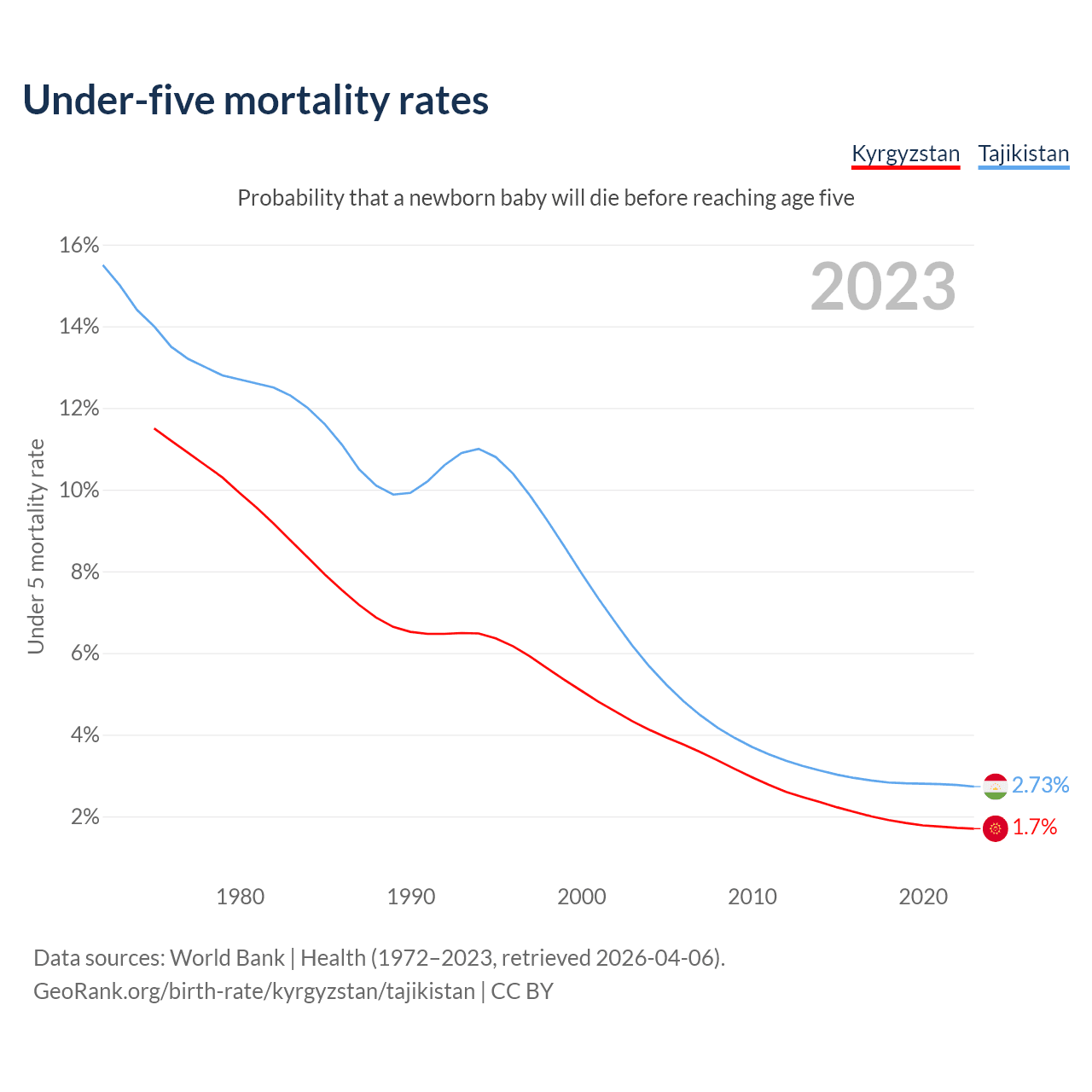 The chance that a newborn baby will die before reaching age five is 1.7% in Kyrgyzstan and 2.73% in Tajikistan. Above is a chart with historical data on under-five mortality rates.