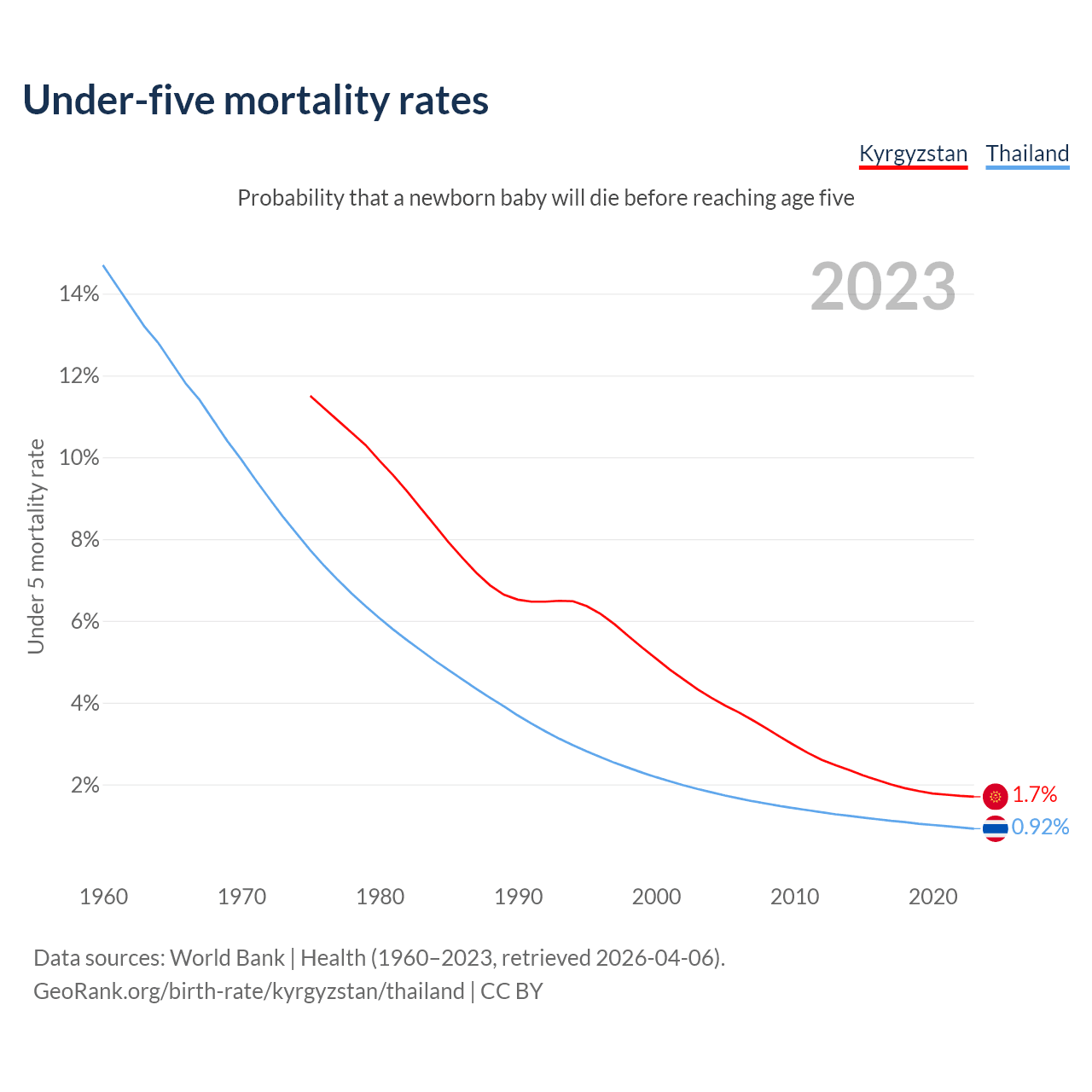 The chance that a newborn baby will die before reaching age five is 1.7% in Kyrgyzstan and 0.92% in Thailand. Above is a chart with historical data on under-five mortality rates.