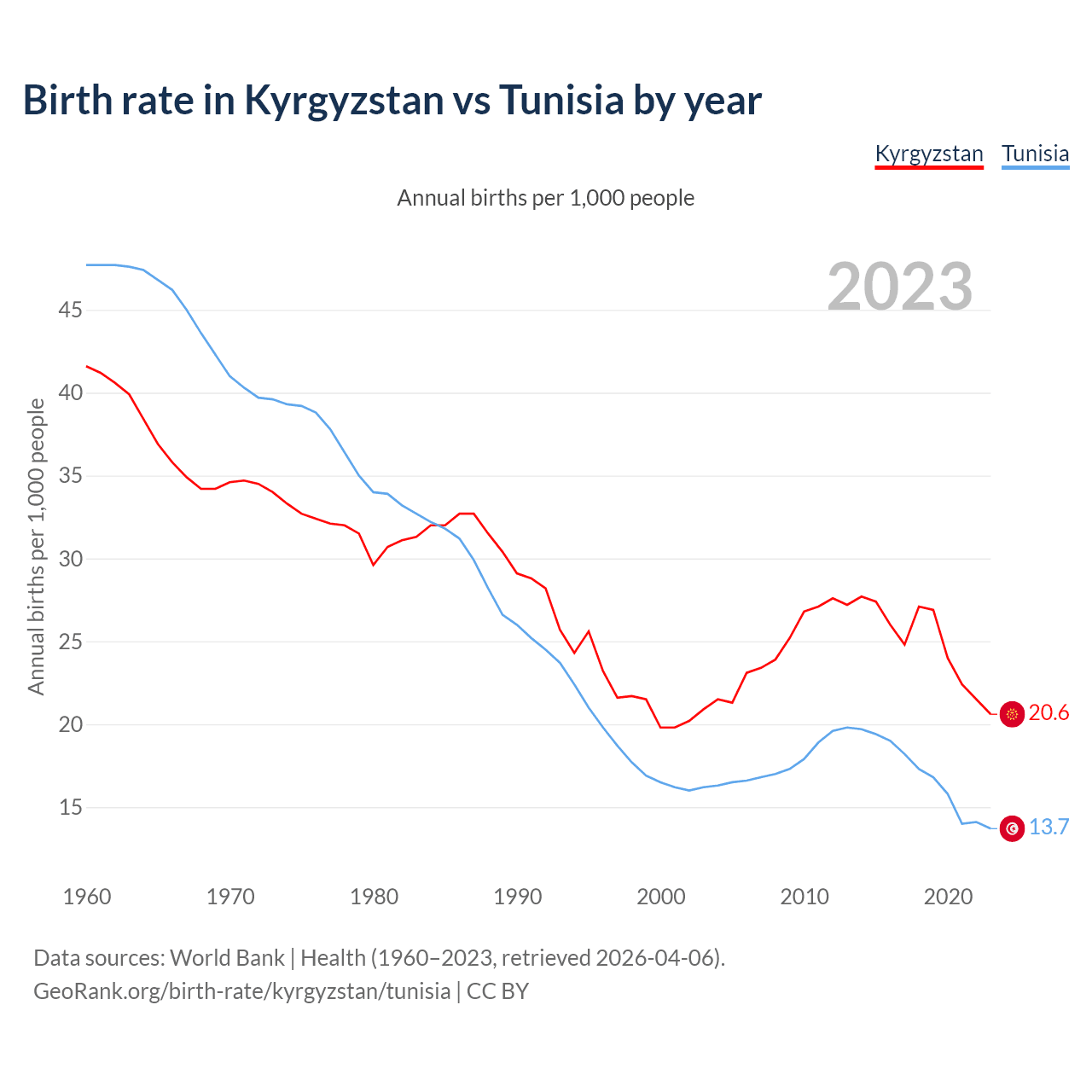 Kyrgyzstan has an annual birth rate of 20.6 births per 1,000 people, compared to 13.7 for Tunisia. The average number of children a woman is expected to have during her lifetime — the fertility rate, is 2.7 in Kyrgyzstan and 1.83 in Tunisia — 32.1% difference.