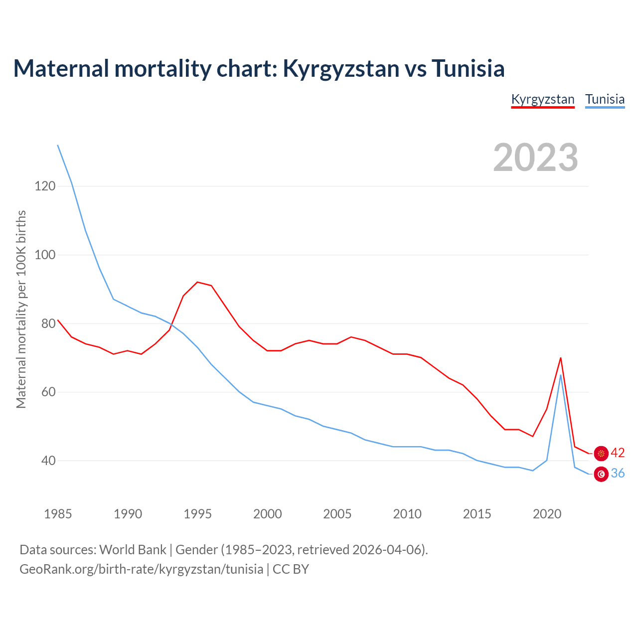 The maternal mortality rate, which is the probability of dying during childbirth or within 42 days of pregnancy termination, is 42 deaths per 100,000 live births in Kyrgyzstan, compared to 36 deaths in Tunisia.