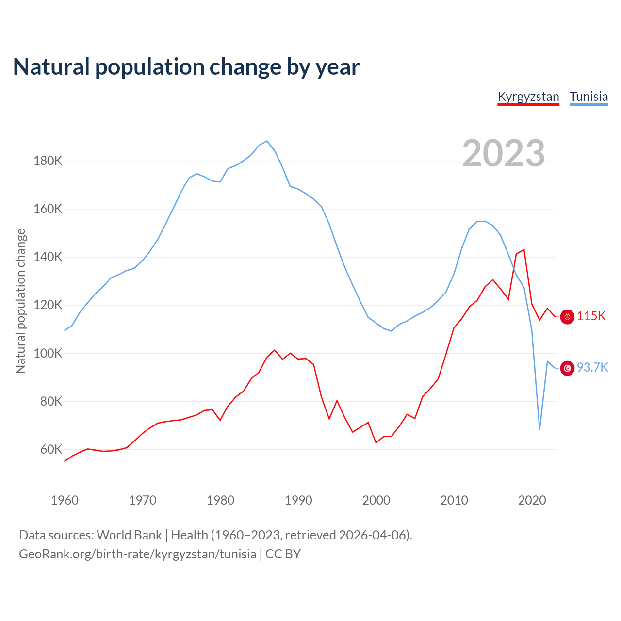 - Kyrgyzstan is ranked 73/196 by birth rate compared to 104/196 for Tunisia.