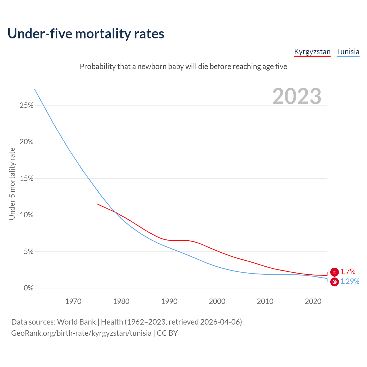 The chance that a newborn baby will die before reaching age five is 1.7% in Kyrgyzstan and 1.29% in Tunisia. Above is a chart with historical data on under-five mortality rates.