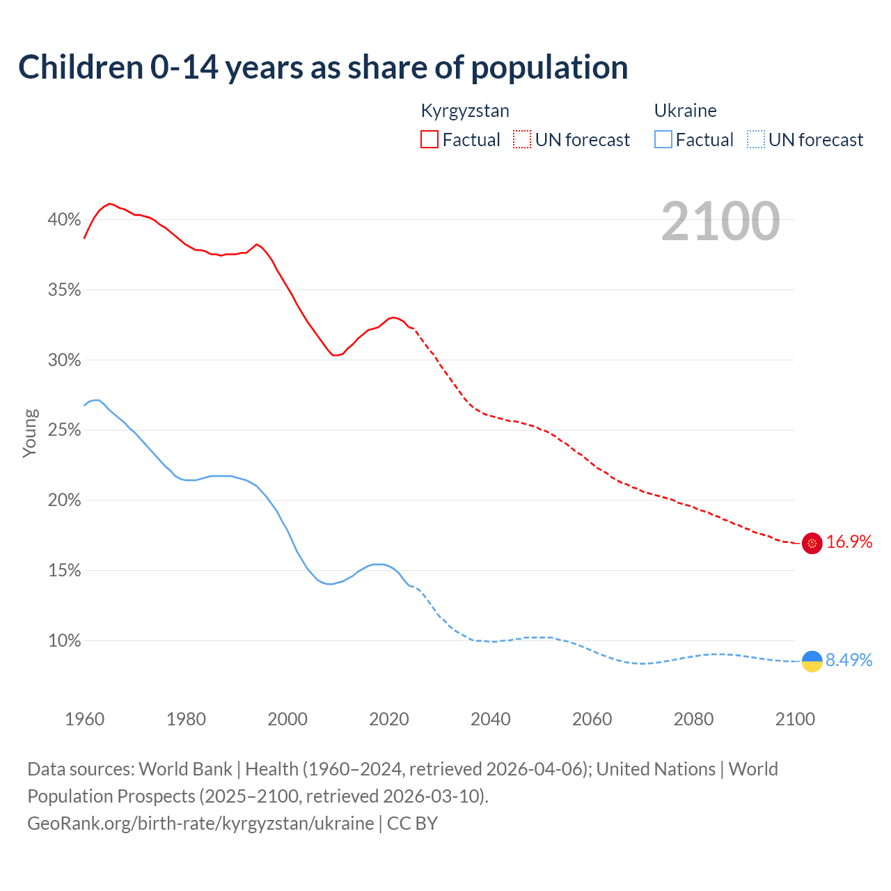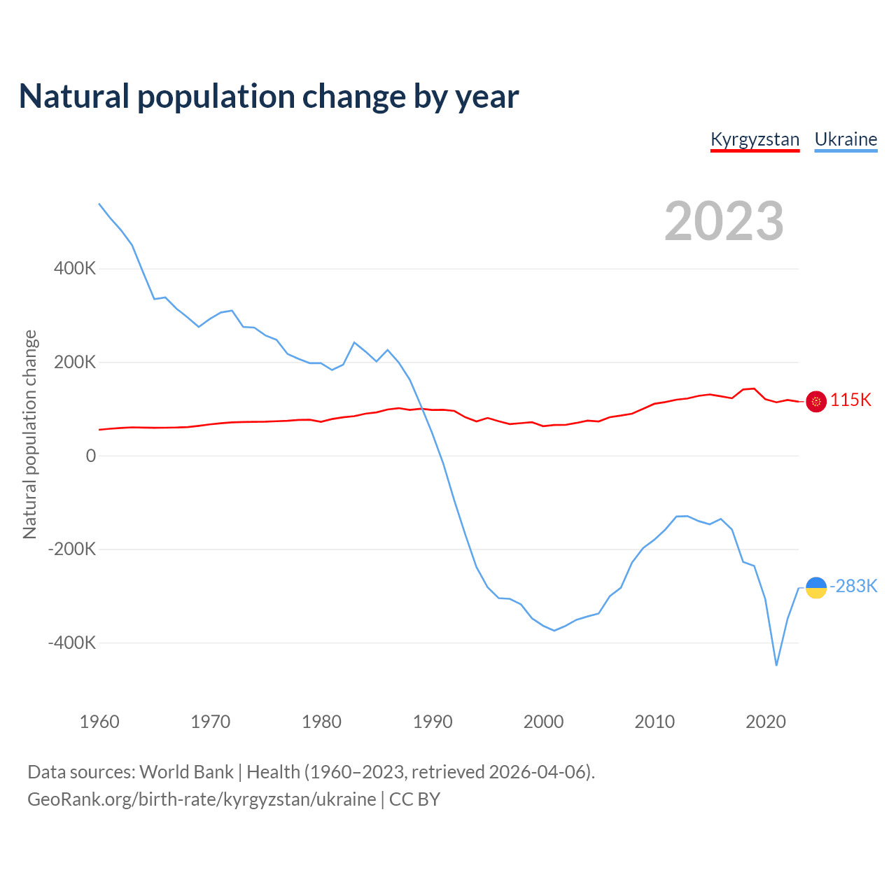 Kyrgyzstan has an annual birth rate of 20.6 births per 1,000 people, compared to 5.63 for Ukraine. The average number of children a woman is expected to have during her lifetime — the fertility rate, is 2.7 in Kyrgyzstan and 0.98 in Ukraine — 63.8% difference.