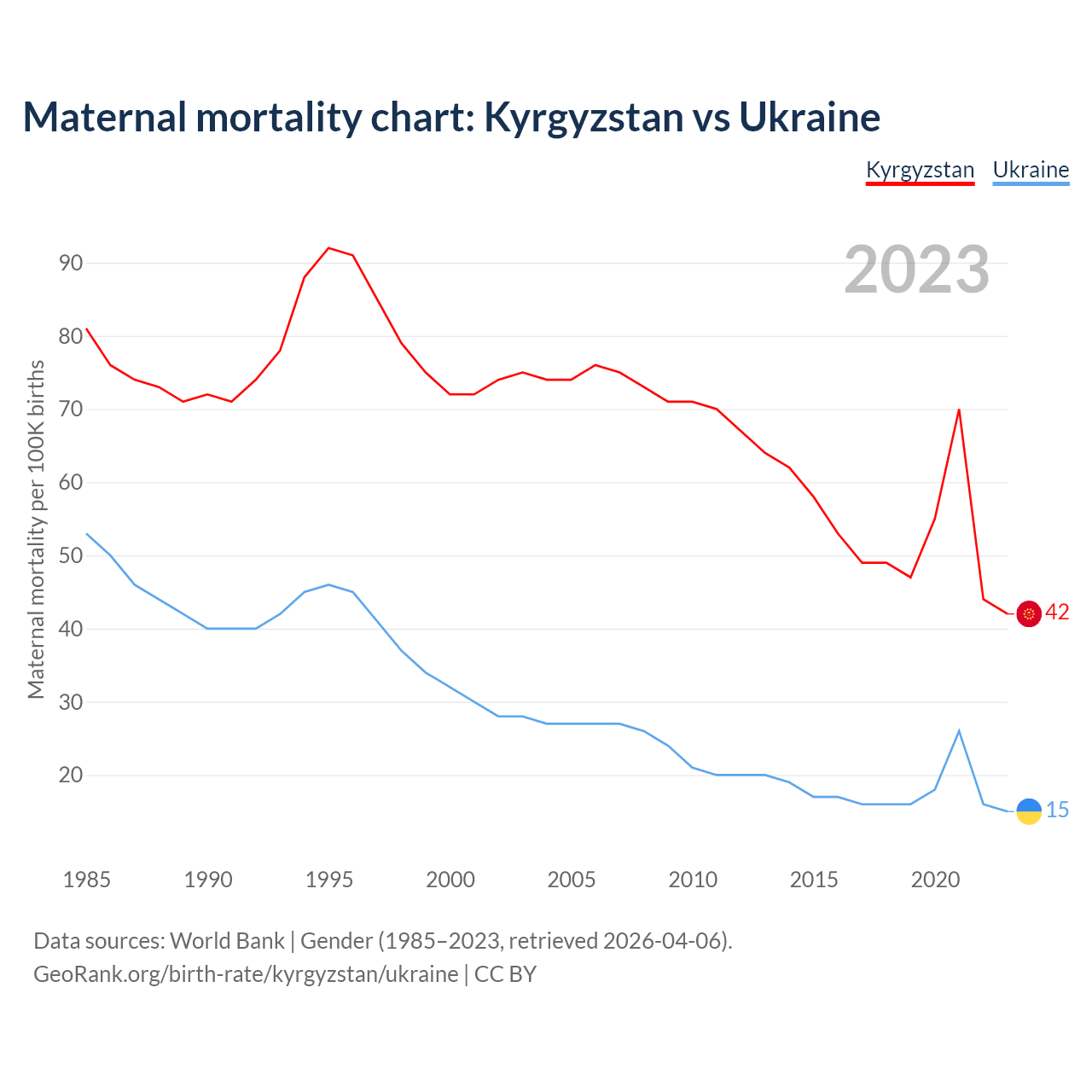 The maternal mortality rate, which is the probability of dying during childbirth or within 42 days of pregnancy termination, is 42 deaths per 100,000 live births in Kyrgyzstan, compared to 15 deaths in Ukraine.