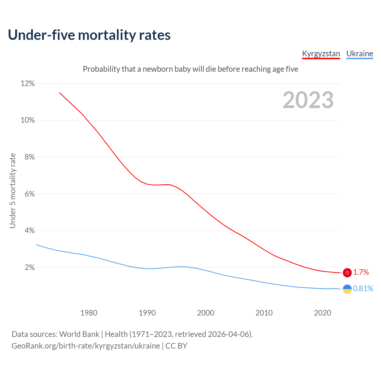 The chance that a newborn baby will die before reaching age five is 1.7% in Kyrgyzstan and 0.81% in Ukraine. Above is a chart with historical data on under-five mortality rates.