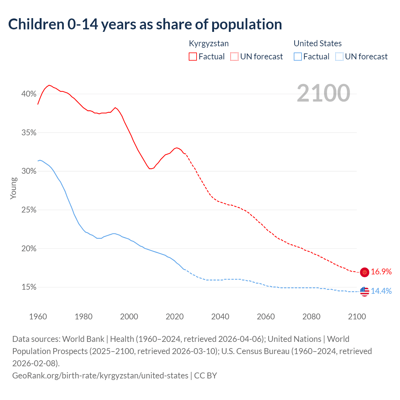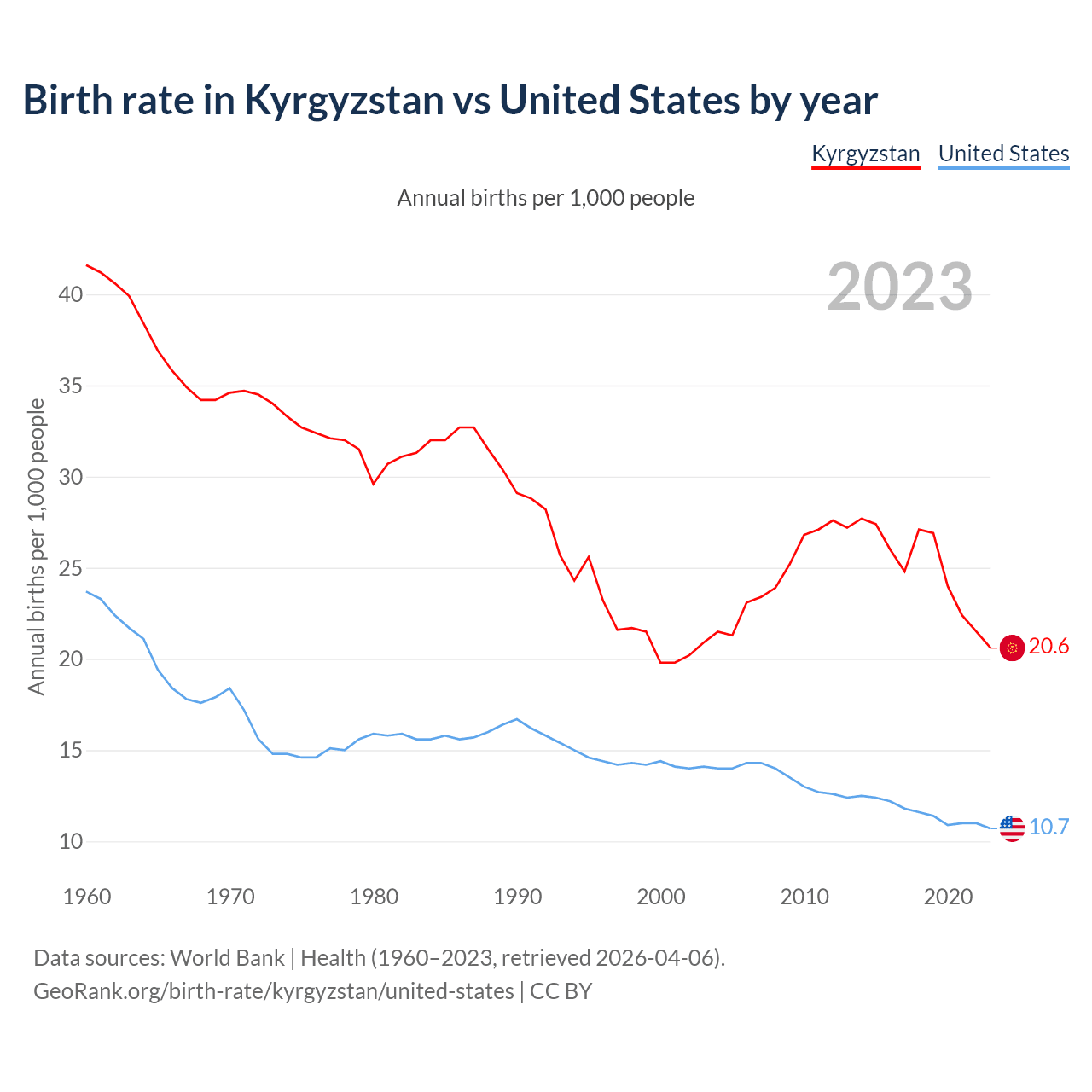 Kyrgyzstan has an annual birth rate of 20.6 births per 1,000 people, compared to 10.7 for the United States. The average number of children a woman is expected to have during her lifetime — the fertility rate, is 2.7 in Kyrgyzstan and 1.62 in the United States — 40.1% difference.