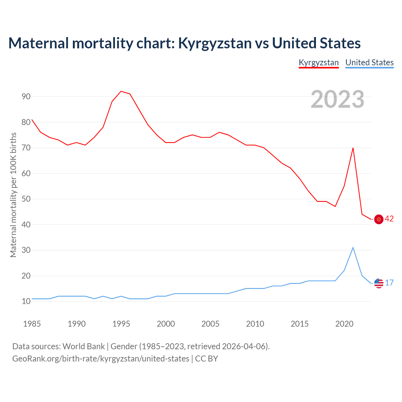 The maternal mortality rate, which is the probability of dying during childbirth or within 42 days of pregnancy termination, is 42 deaths per 100,000 live births in Kyrgyzstan, compared to 17 deaths in the United States.