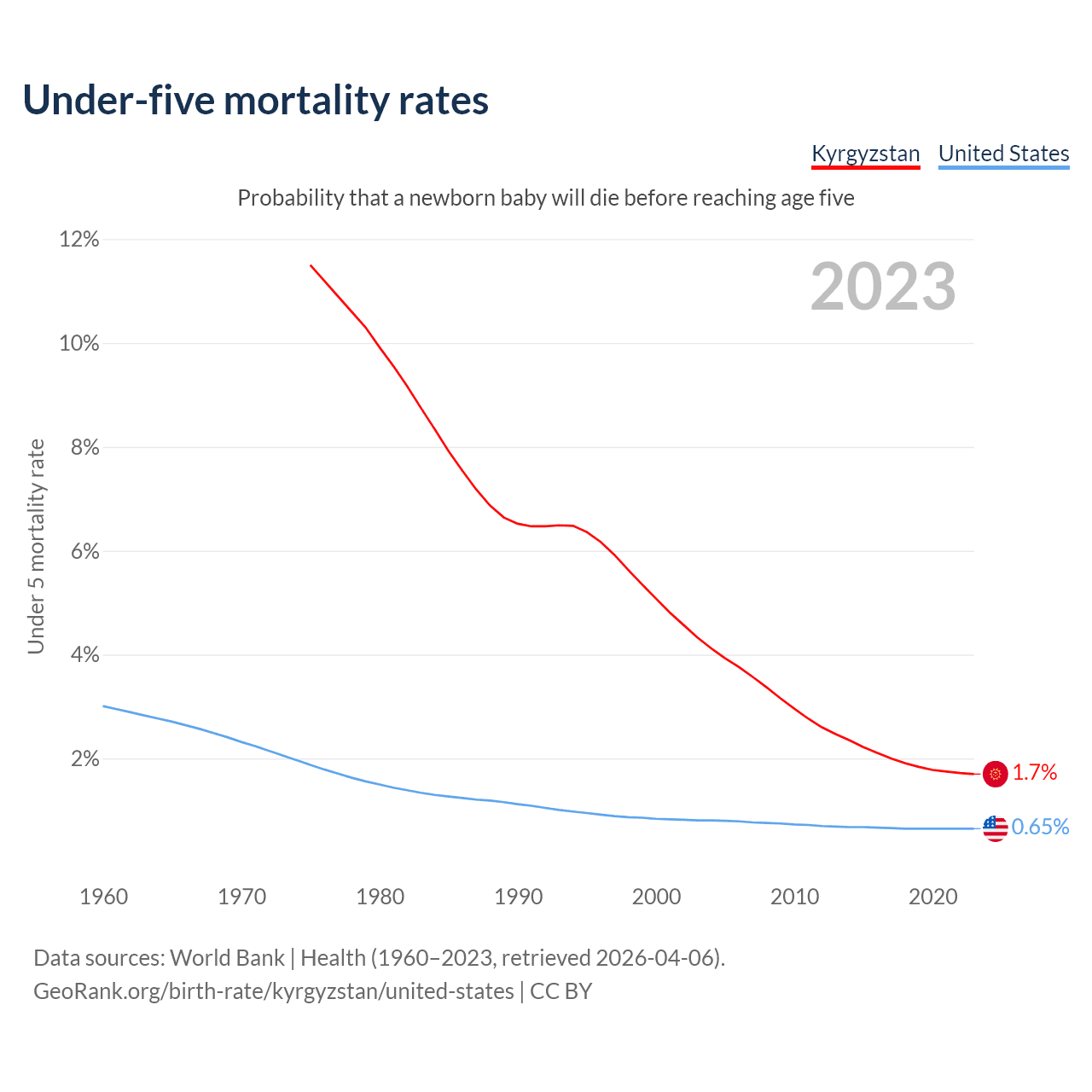 The chance that a newborn baby will die before reaching age five is 1.7% in Kyrgyzstan and 0.65% in the United States. Above is a chart with historical data on under-five mortality rates.
