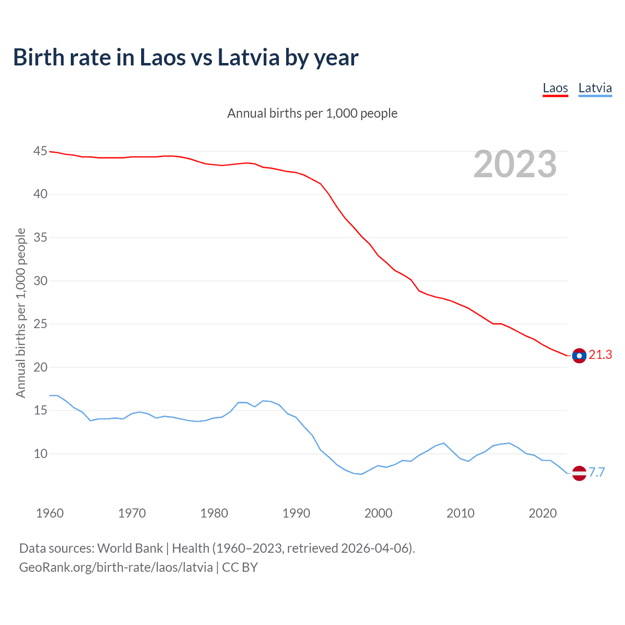 Laos has an annual birth rate of 21.3 births per 1,000 people, compared to 7.7 for Latvia. The average number of children a woman is expected to have during her lifetime — the fertility rate, is 2.42 in Laos and 1.36 in Latvia — 43.8% difference.