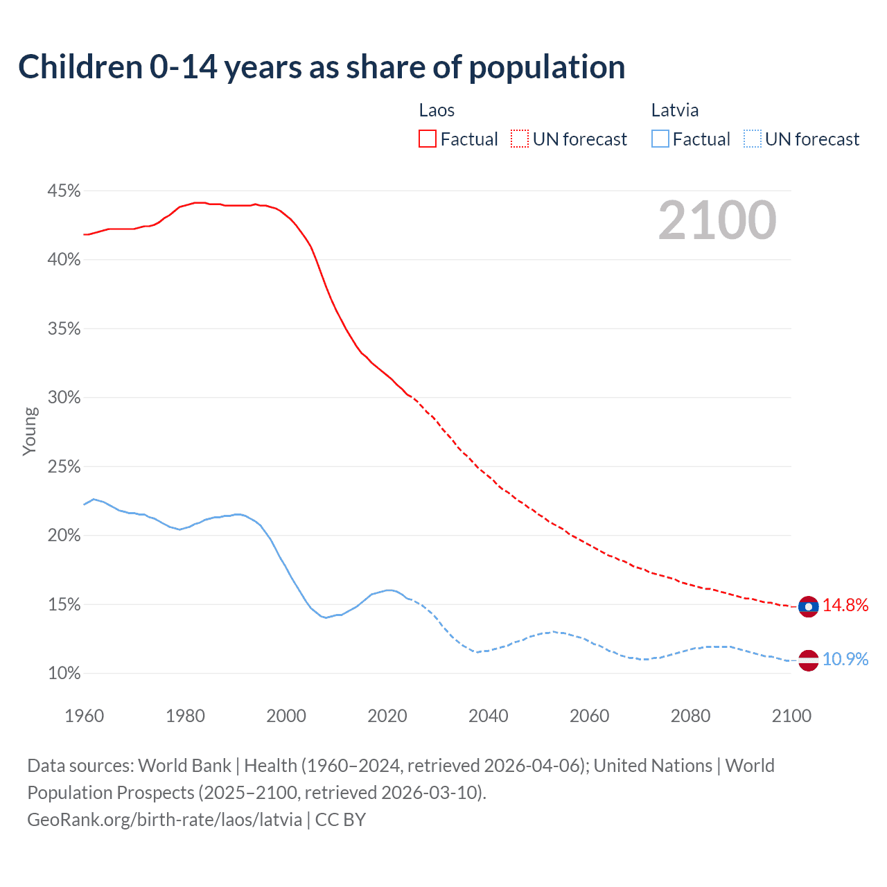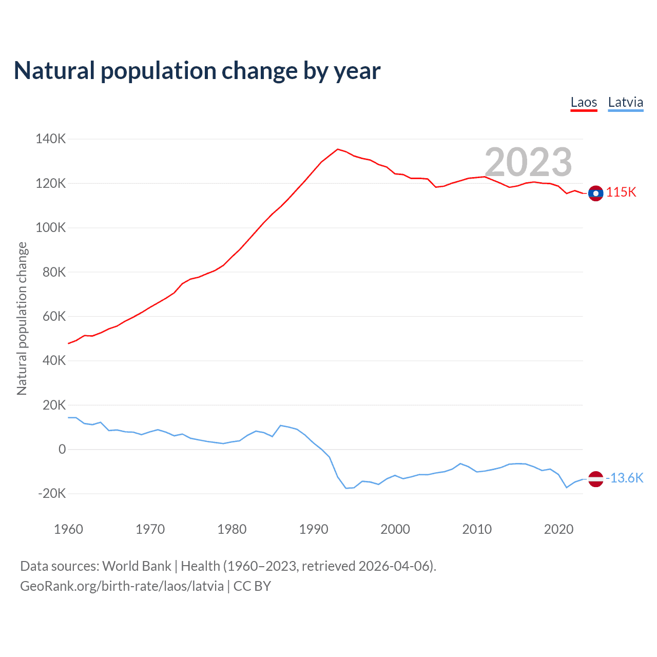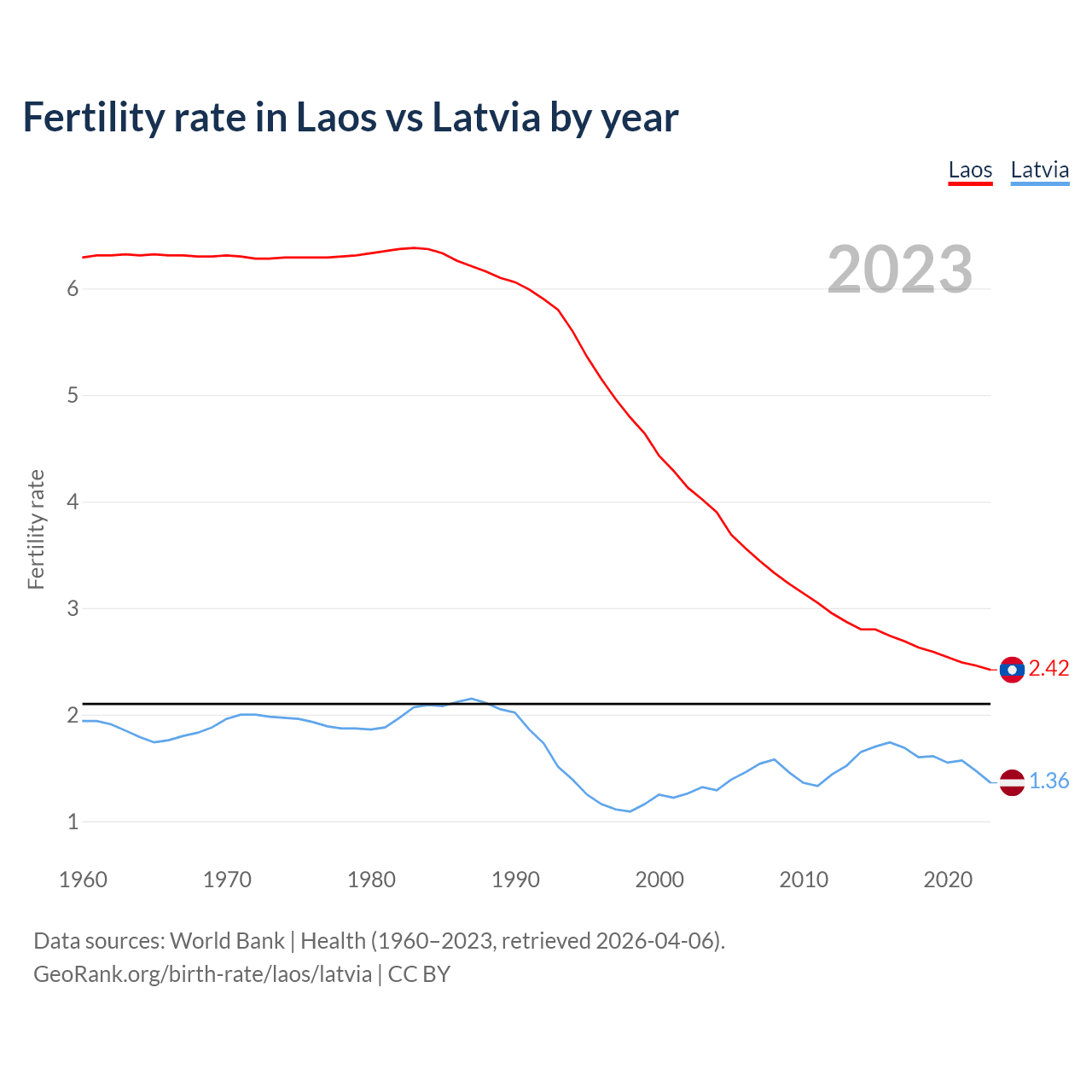 According to the latest available data on birth rates, the fertility rate in Laos was 2.42 children per woman in 2023, compared to 1.36 in Latvia in 2023. The replacement level is considered to be 2.1 children per woman.