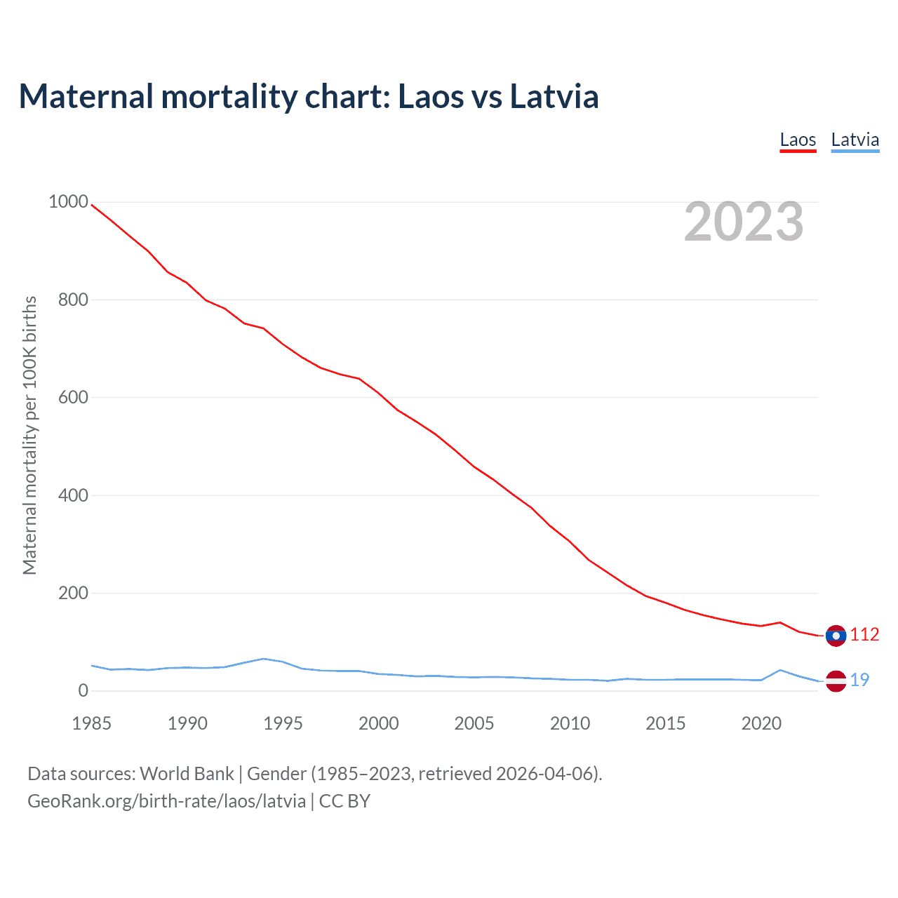 The maternal mortality rate, which is the probability of dying during childbirth or within 42 days of pregnancy termination, is 112 deaths per 100,000 live births in Laos, compared to 19 deaths in Latvia.