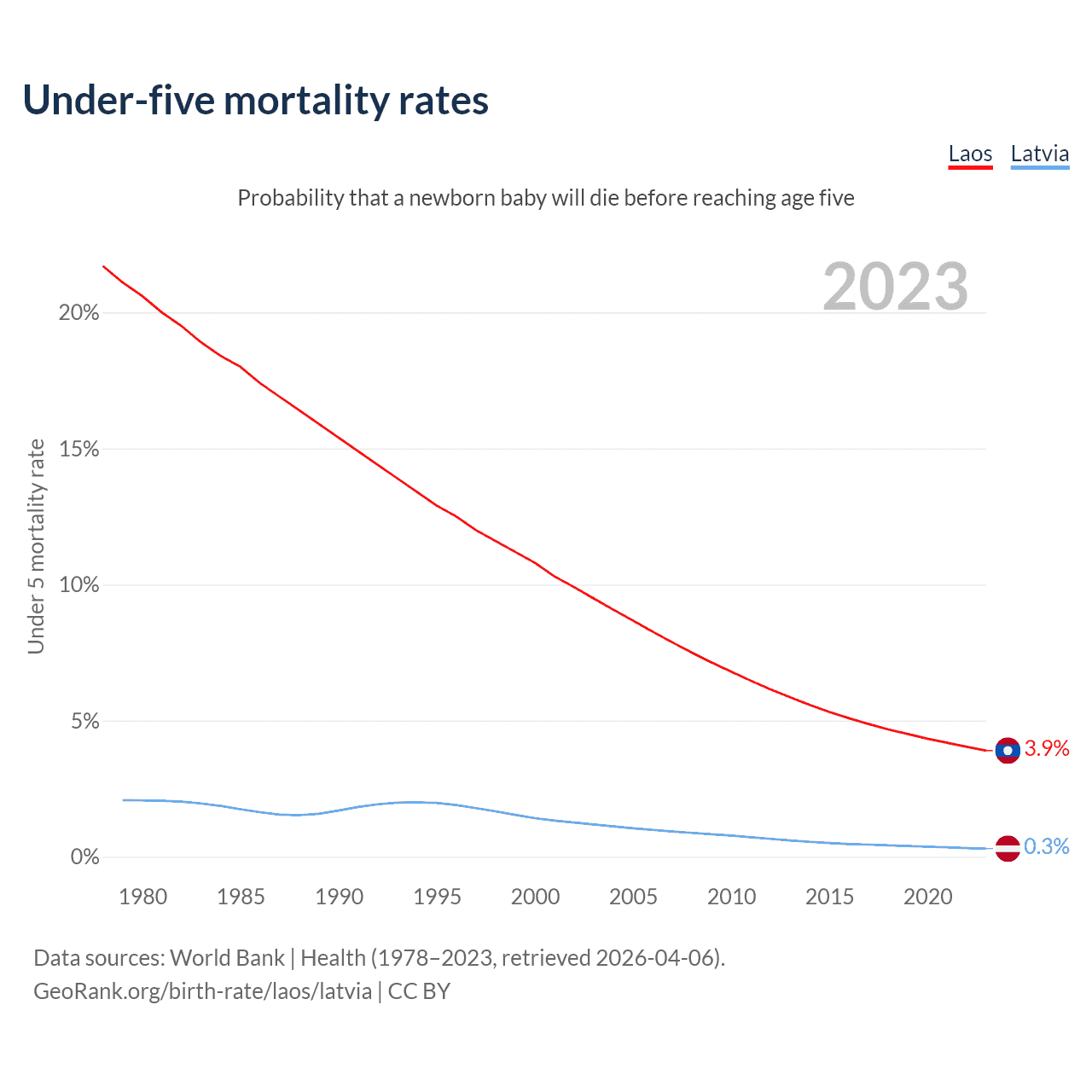 The chance that a newborn baby will die before reaching age five is 3.9% in Laos and 0.3% in Latvia. Above is a chart with historical data on under-five mortality rates.
