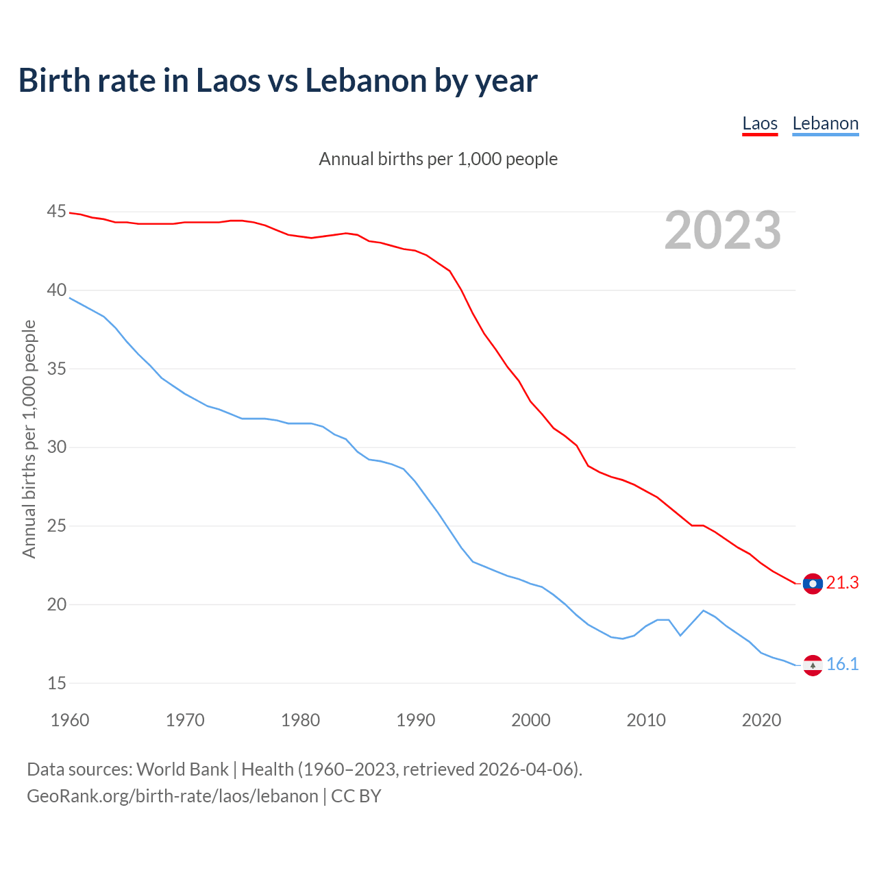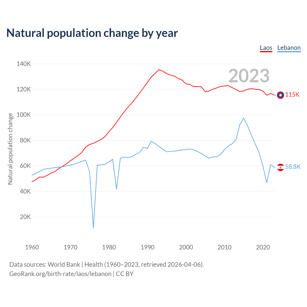 According to the latest available data on birth rates, the fertility rate in Laos was 2.42 children per woman in 2023, compared to 2.24 in Lebanon in 2023. The replacement level is considered to be 2.1 children per woman.