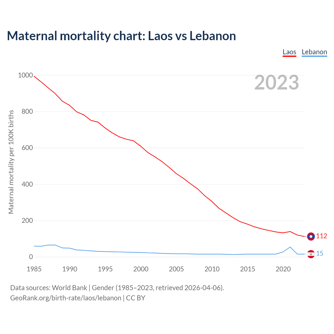 The maternal mortality rate, which is the probability of dying during childbirth or within 42 days of pregnancy termination, is 112 deaths per 100,000 live births in Laos, compared to 15 deaths in Lebanon.