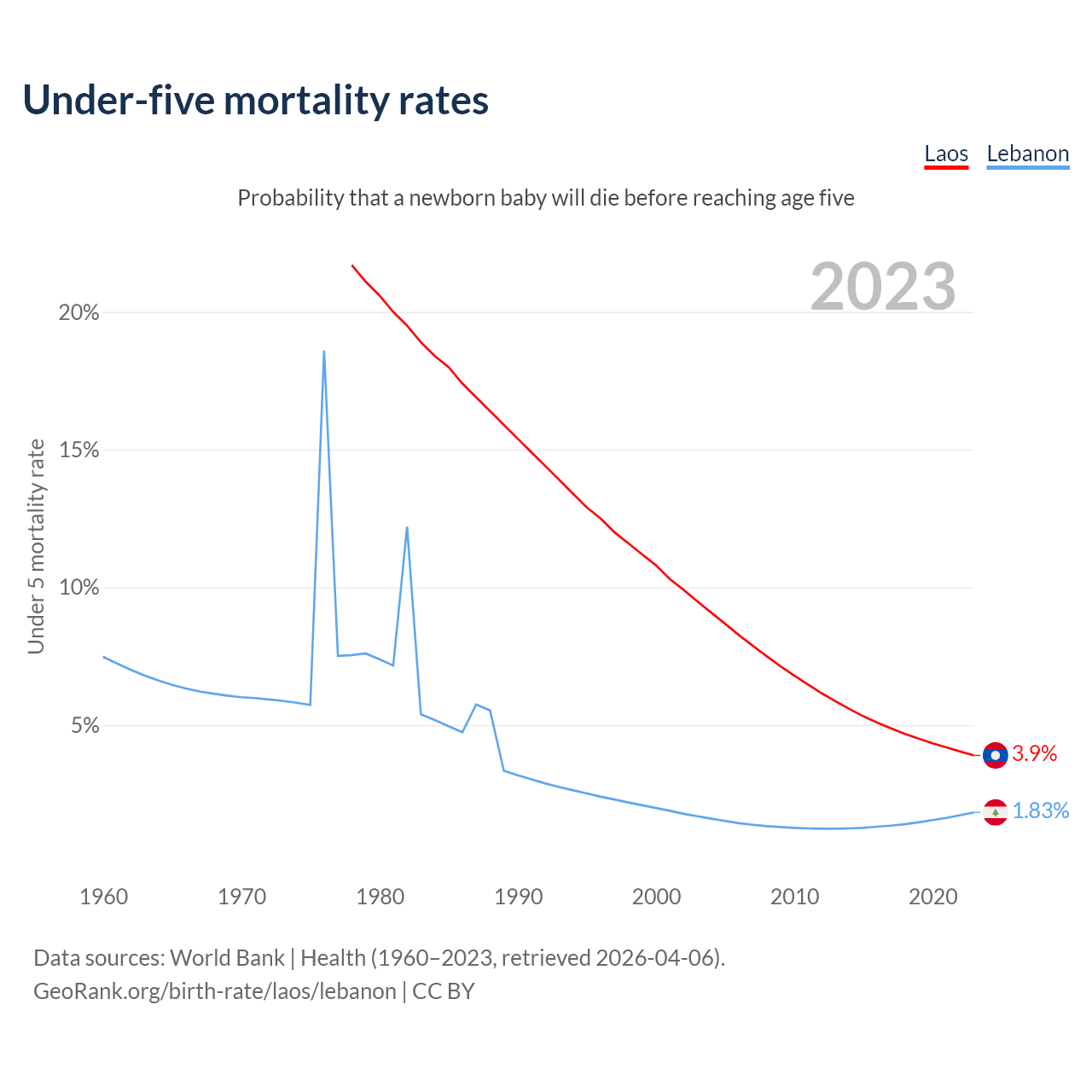 The chance that a newborn baby will die before reaching age five is 3.9% in Laos and 1.83% in Lebanon. Above is a chart with historical data on under-five mortality rates.