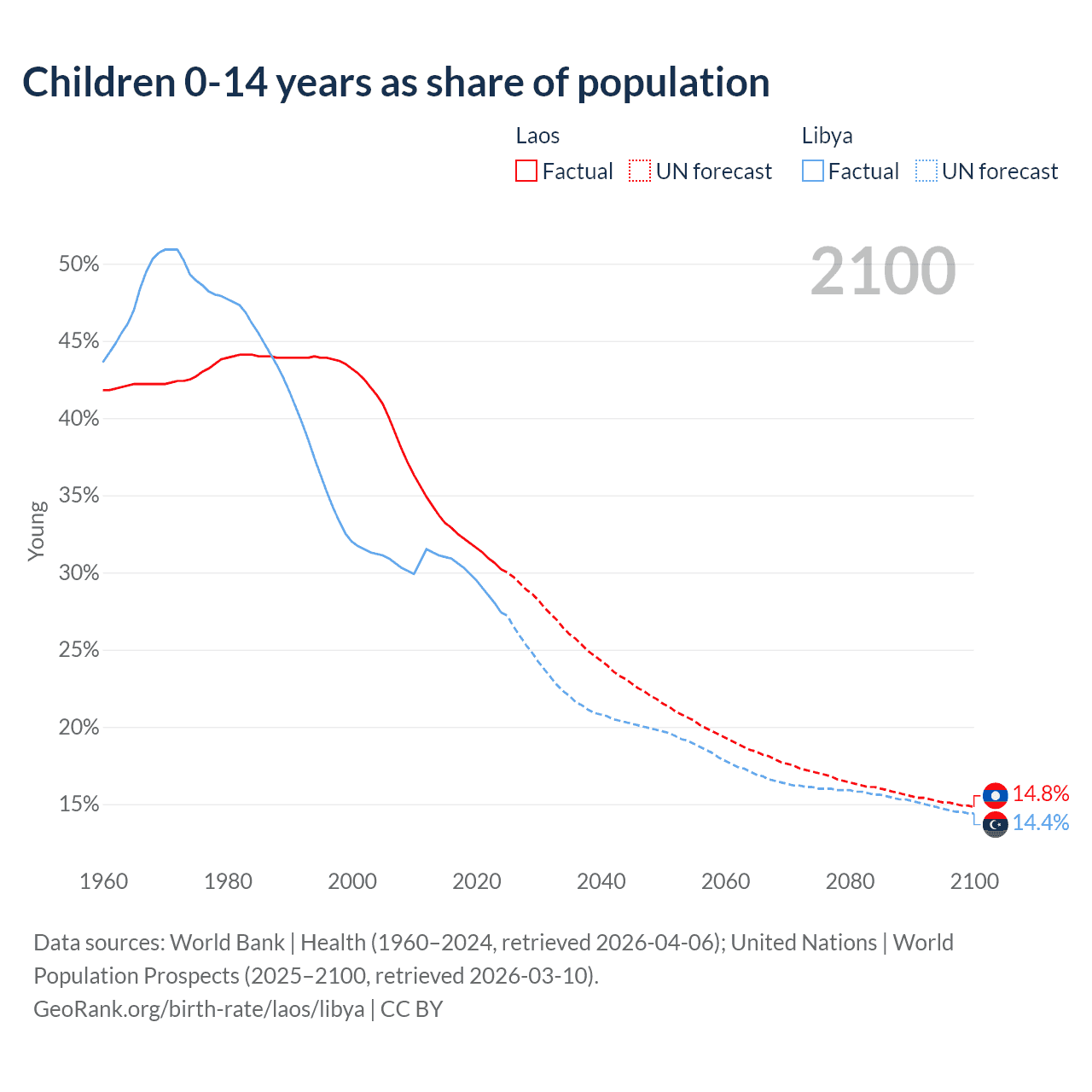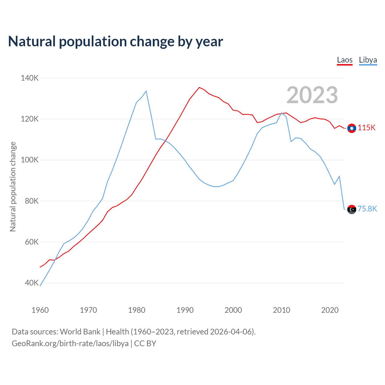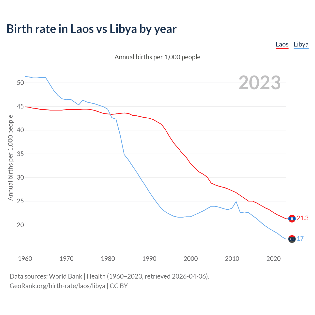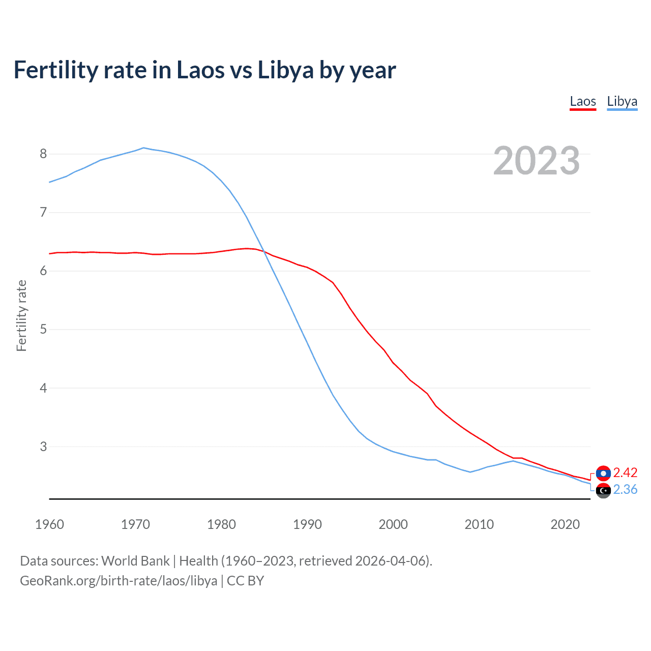 According to the latest available data on birth rates, the fertility rate in Laos was 2.42 children per woman in 2023, compared to 2.36 in Libya in 2023. The replacement level is considered to be 2.1 children per woman.