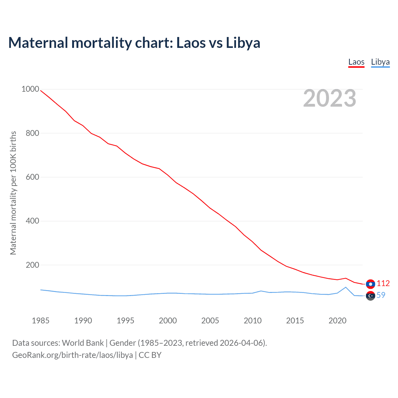 The maternal mortality rate, which is the probability of dying during childbirth or within 42 days of pregnancy termination, is 112 deaths per 100,000 live births in Laos, compared to 59 deaths in Libya.