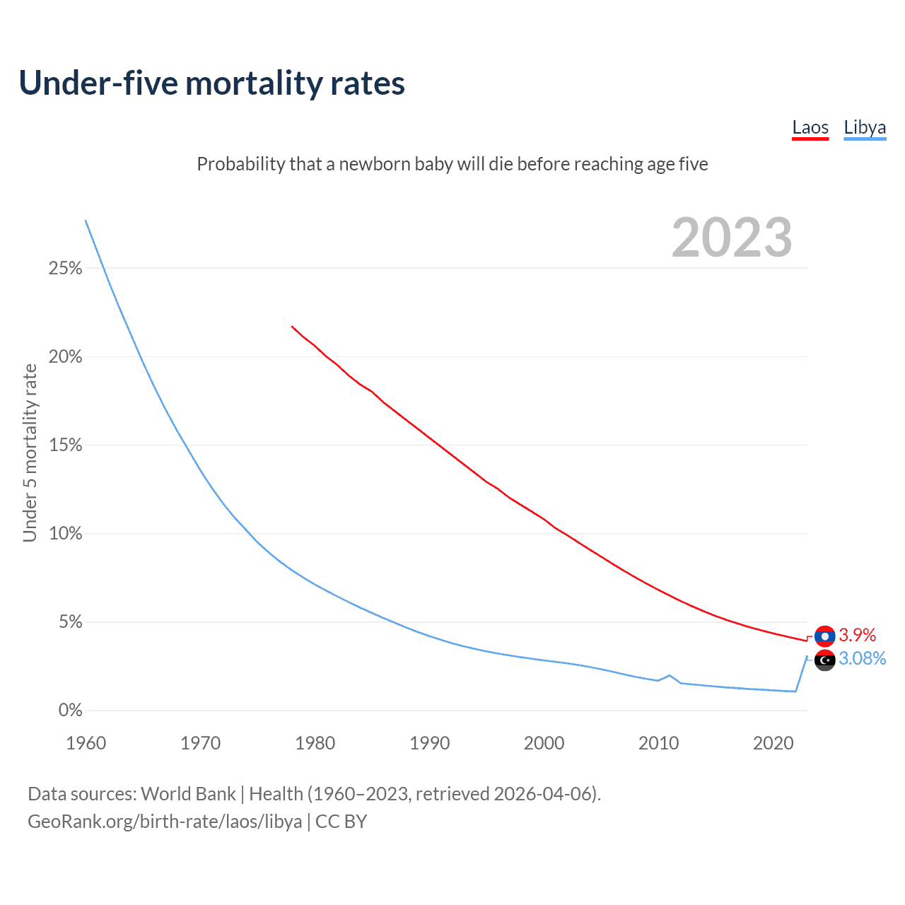 The chance that a newborn baby will die before reaching age five is 3.9% in Laos and 3.08% in Libya. Above is a chart with historical data on under-five mortality rates.