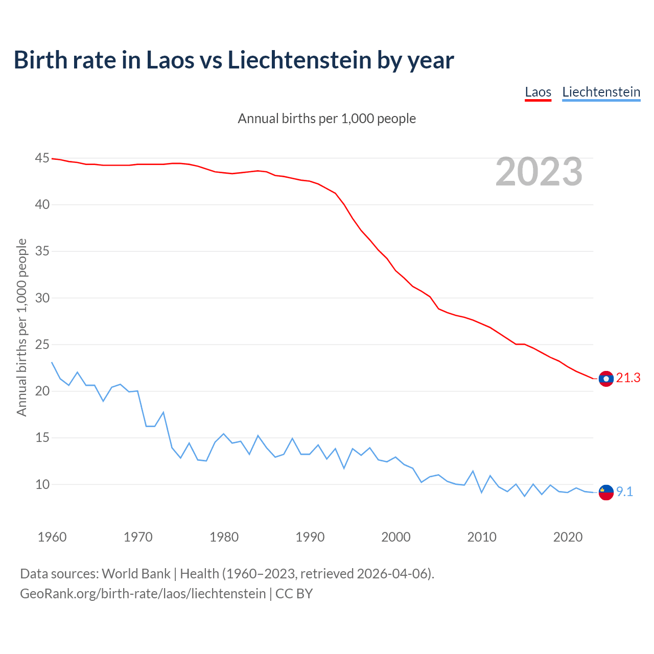 Laos has an annual birth rate of 21.3 births per 1,000 people, compared to 9.1 for Liechtenstein. The average number of children a woman is expected to have during her lifetime — the fertility rate, is 2.42 in Laos and 1.45 in Liechtenstein — 40.1% difference.