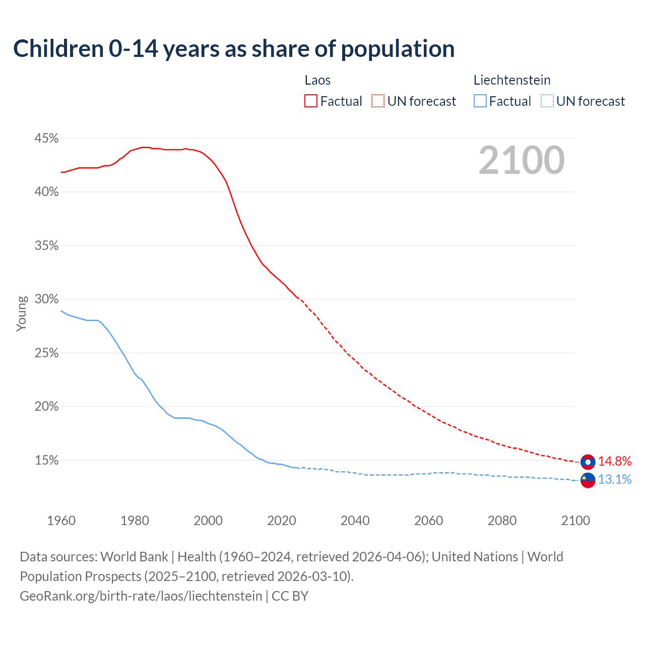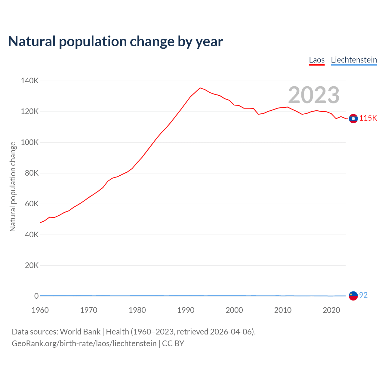 According to the latest available data on birth rates, the fertility rate in Laos was 2.42 children per woman in 2023, compared to 1.45 in Liechtenstein in 2023. The replacement level is considered to be 2.1 children per woman.