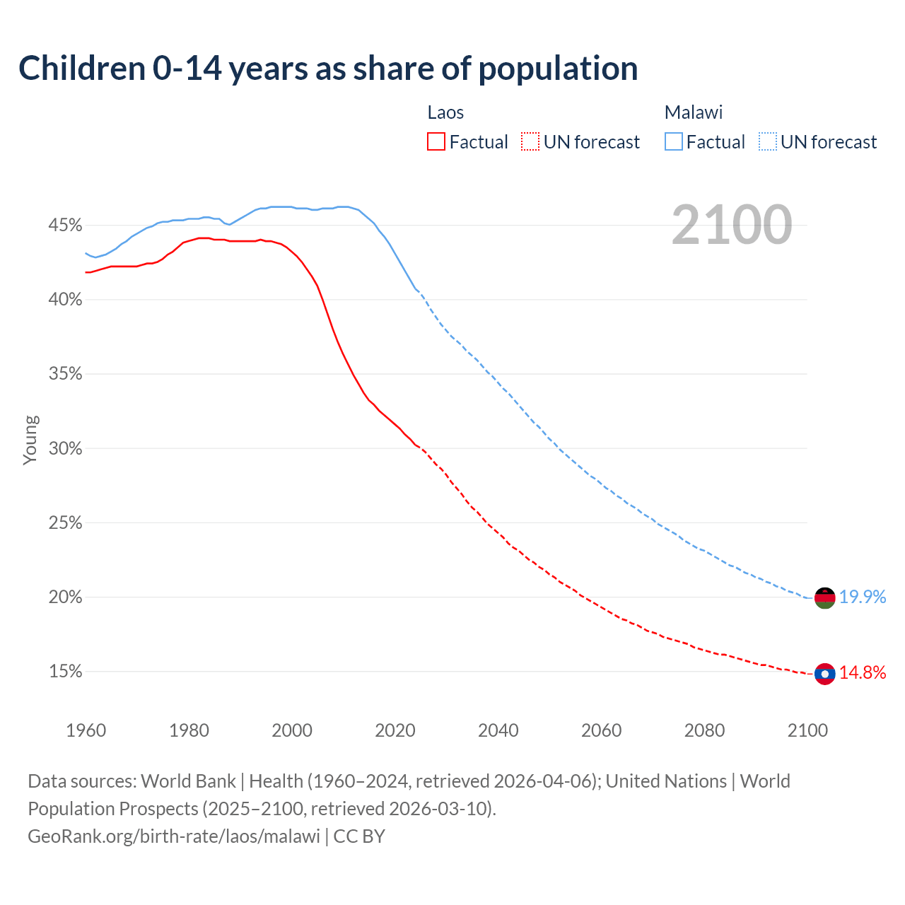 According to the latest available data on birth rates, the fertility rate in Laos was 2.42 children per woman in 2023, compared to 3.65 in Malawi in 2023. The replacement level is considered to be 2.1 children per woman.