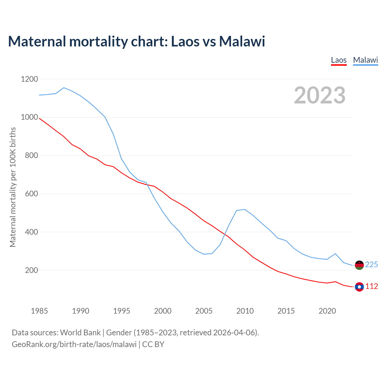 The maternal mortality rate, which is the probability of dying during childbirth or within 42 days of pregnancy termination, is 112 deaths per 100,000 live births in Laos, compared to 225 deaths in Malawi.