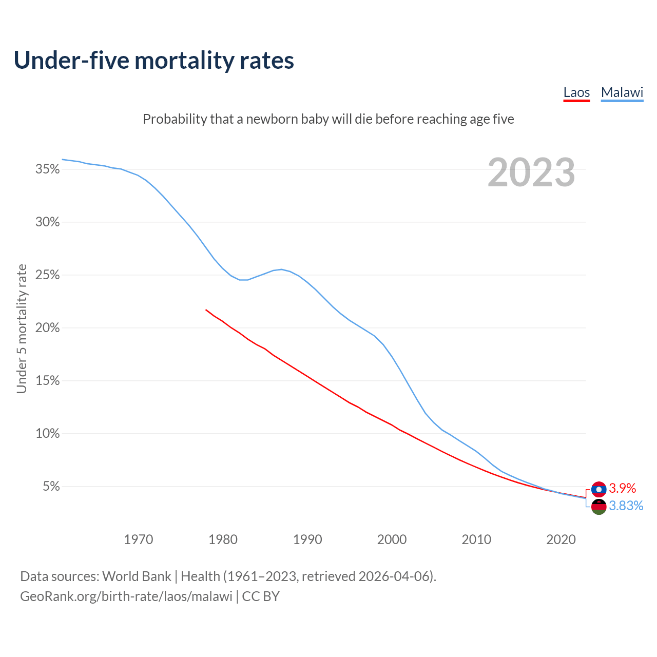 The chance that a newborn baby will die before reaching age five is 3.9% in Laos and 3.83% in Malawi. Above is a chart with historical data on under-five mortality rates.