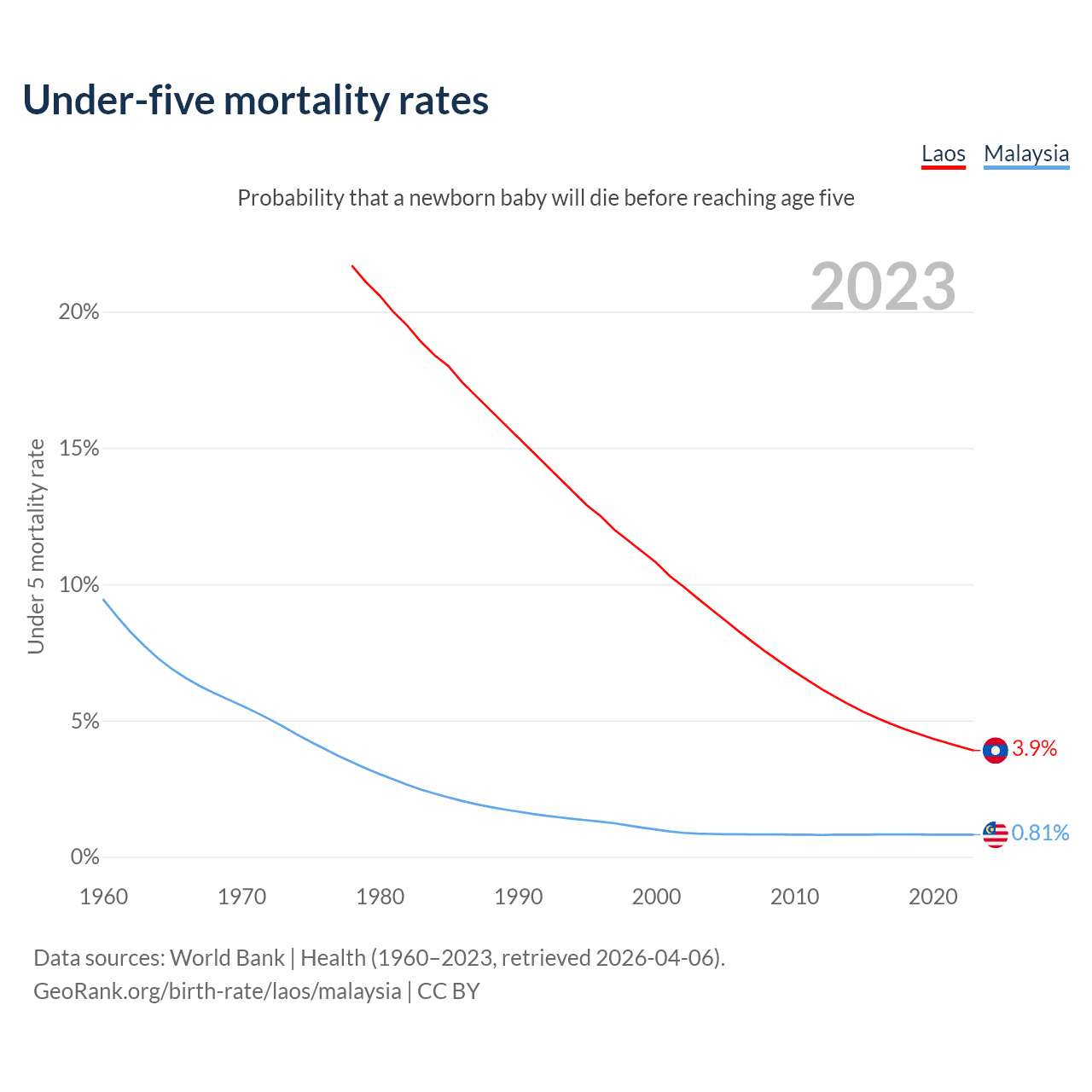 The chance that a newborn baby will die before reaching age five is 3.9% in Laos and 0.81% in Malaysia. Above is a chart with historical data on under-five mortality rates.
