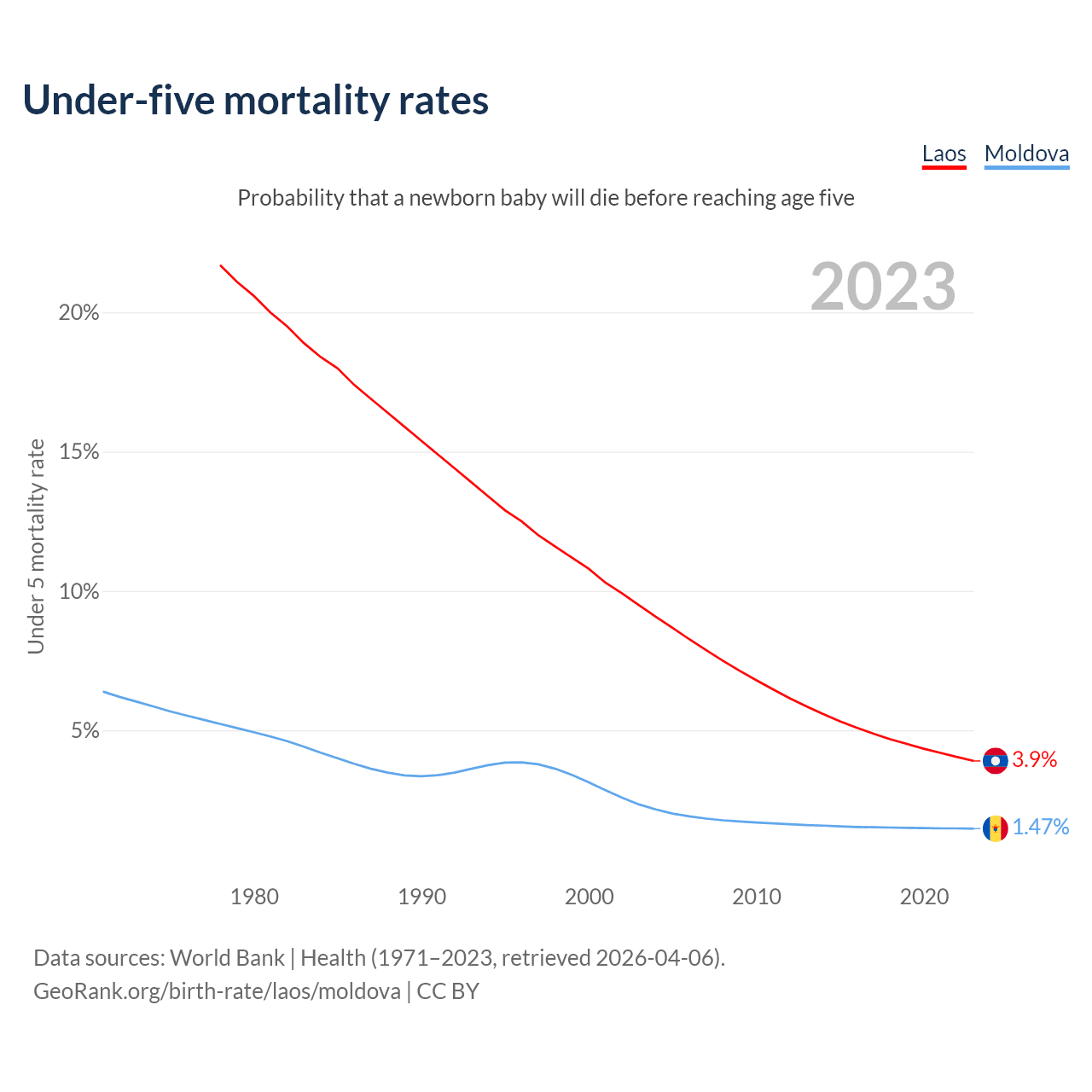 The chance that a newborn baby will die before reaching age five is 3.9% in Laos and 1.47% in Moldova. Above is a chart with historical data on under-five mortality rates.