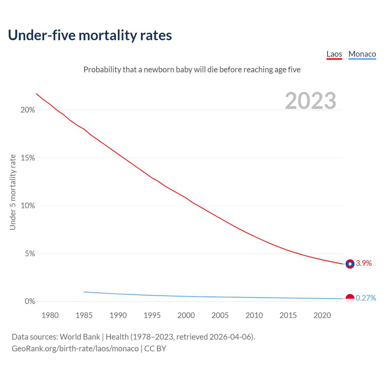 The chance that a newborn baby will die before reaching age five is 3.9% in Laos and 0.27% in Monaco. Above is a chart with historical data on under-five mortality rates.
