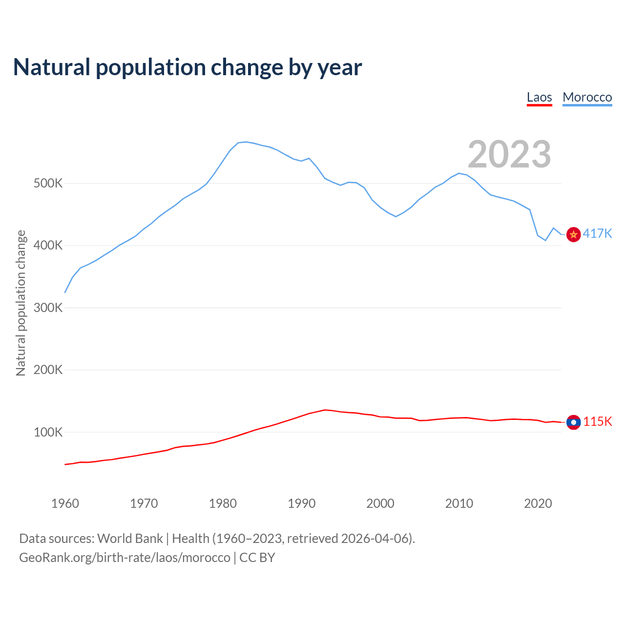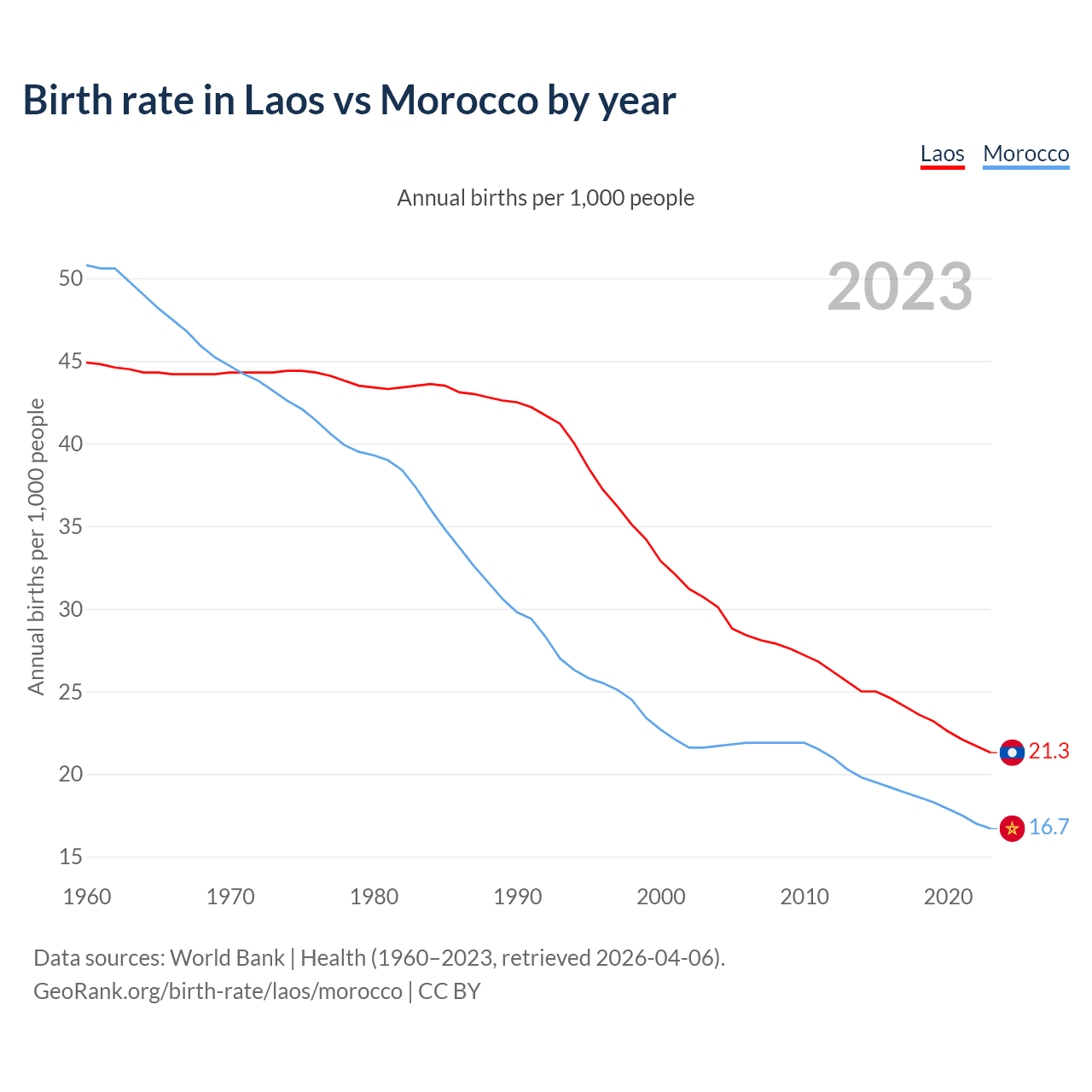 Laos has an annual birth rate of 21.3 births per 1,000 people, compared to 16.7 for Morocco. The average number of children a woman is expected to have during her lifetime — the fertility rate, is 2.42 in Laos and 2.23 in Morocco — 7.89% difference.