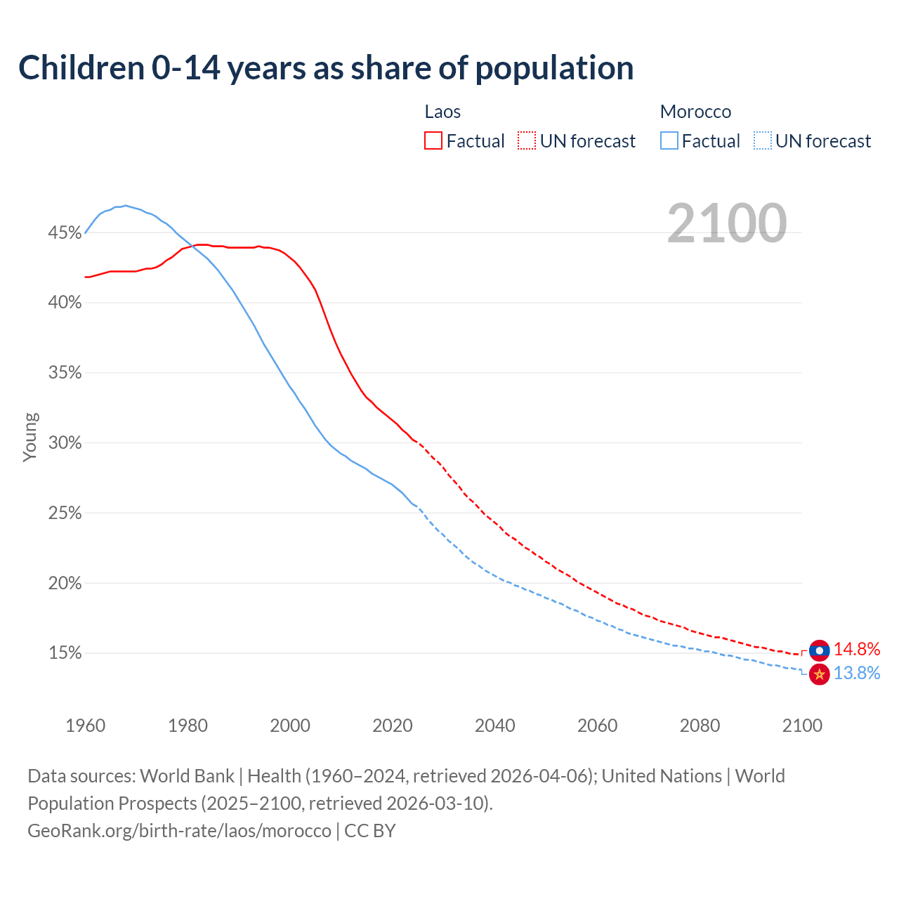 According to the latest available data on birth rates, the fertility rate in Laos was 2.42 children per woman in 2023, compared to 2.23 in Morocco in 2023. The replacement level is considered to be 2.1 children per woman.