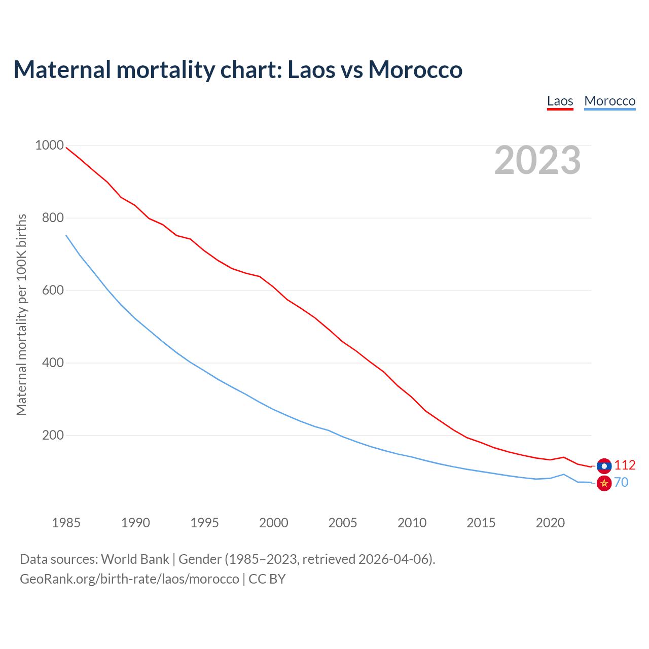 The maternal mortality rate, which is the probability of dying during childbirth or within 42 days of pregnancy termination, is 112 deaths per 100,000 live births in Laos, compared to 70 deaths in Morocco.