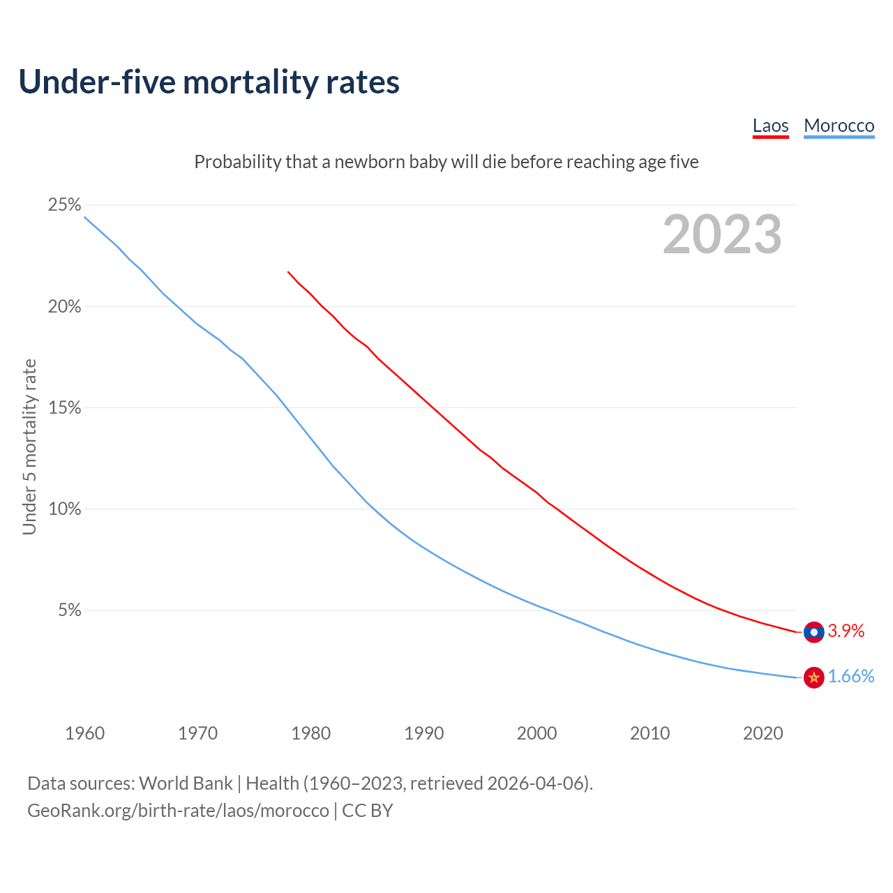 The chance that a newborn baby will die before reaching age five is 3.9% in Laos and 1.66% in Morocco. Above is a chart with historical data on under-five mortality rates.