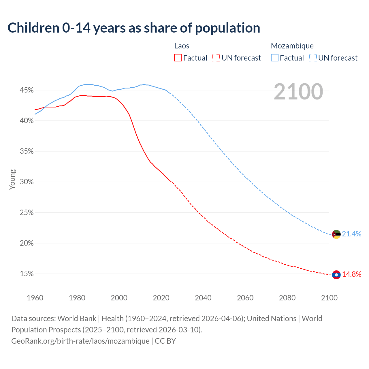 According to the latest available data on birth rates, the fertility rate in Laos was 2.42 children per woman in 2023, compared to 4.76 in Mozambique in 2023. The replacement level is considered to be 2.1 children per woman.