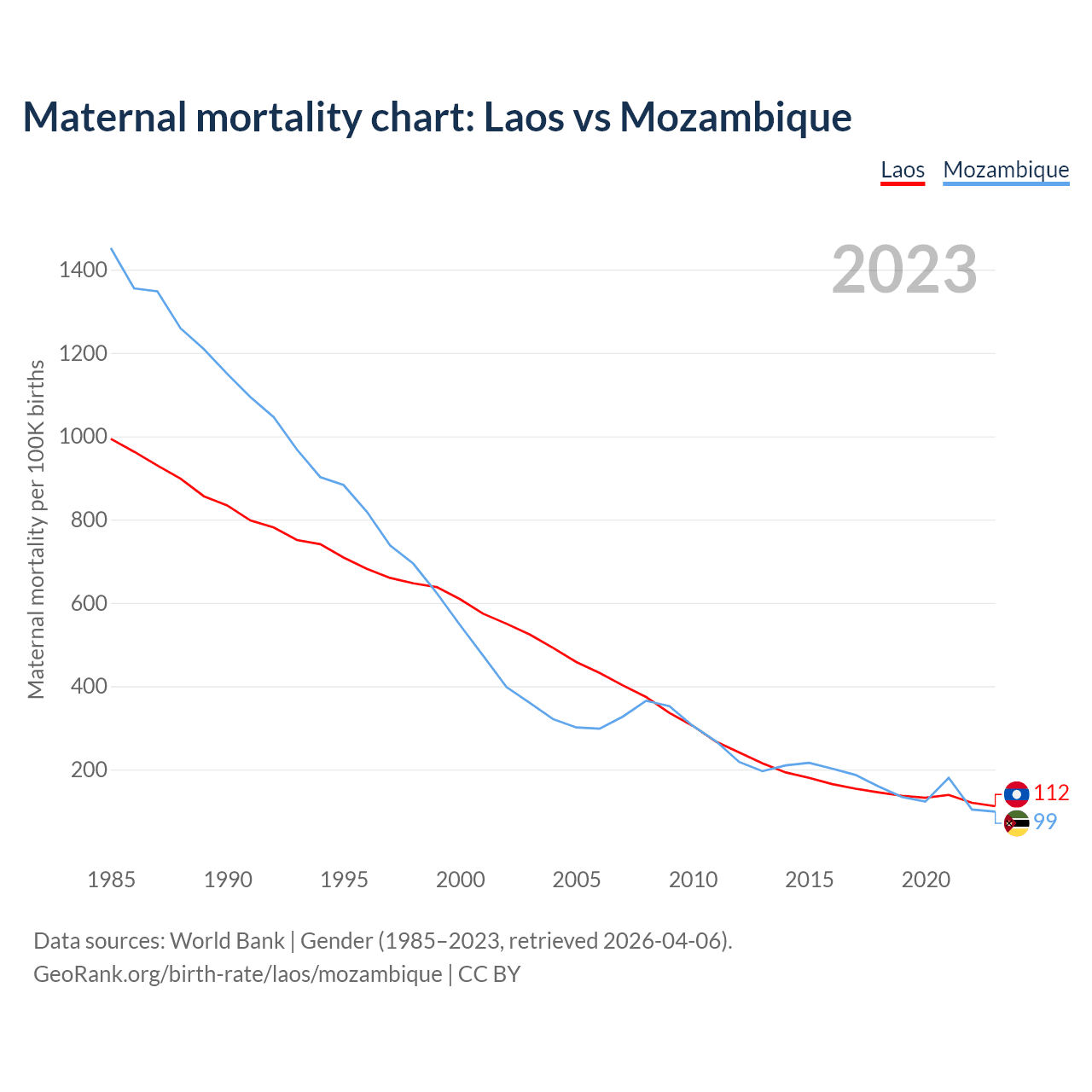 The maternal mortality rate, which is the probability of dying during childbirth or within 42 days of pregnancy termination, is 112 deaths per 100,000 live births in Laos, compared to 99 deaths in Mozambique.