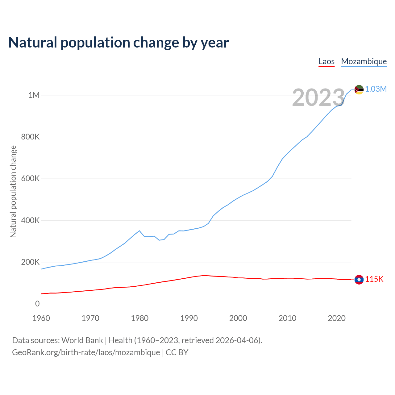 Laos has an annual birth rate of 21.3 births per 1,000 people, compared to 37.5 for Mozambique. The average number of children a woman is expected to have during her lifetime — the fertility rate, is 2.42 in Laos and 4.76 in Mozambique — 96.7% difference.