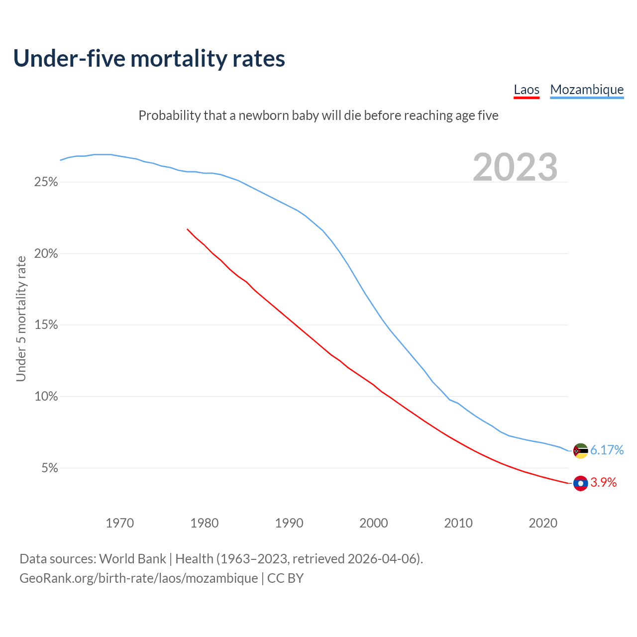 The chance that a newborn baby will die before reaching age five is 3.9% in Laos and 6.17% in Mozambique. Above is a chart with historical data on under-five mortality rates.