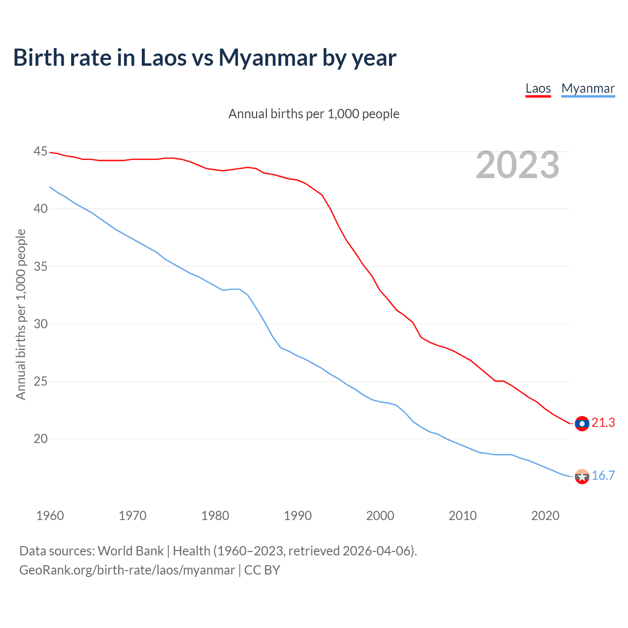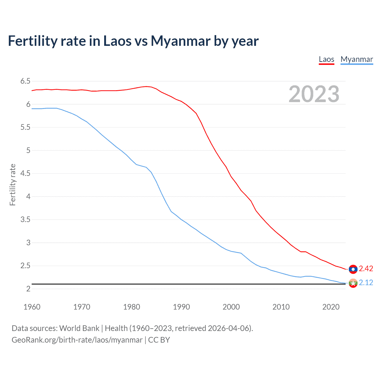 According to the latest available data on birth rates, the fertility rate in Laos was 2.42 children per woman in 2023, compared to 2.12 in Myanmar in 2023. The replacement level is considered to be 2.1 children per woman.