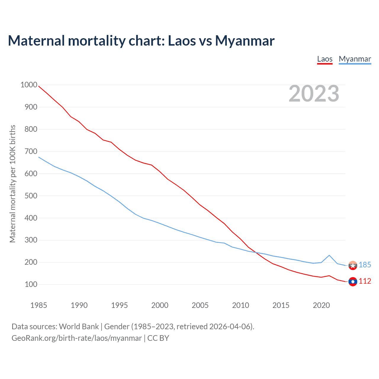 The maternal mortality rate, which is the probability of dying during childbirth or within 42 days of pregnancy termination, is 112 deaths per 100,000 live births in Laos, compared to 185 deaths in Myanmar.