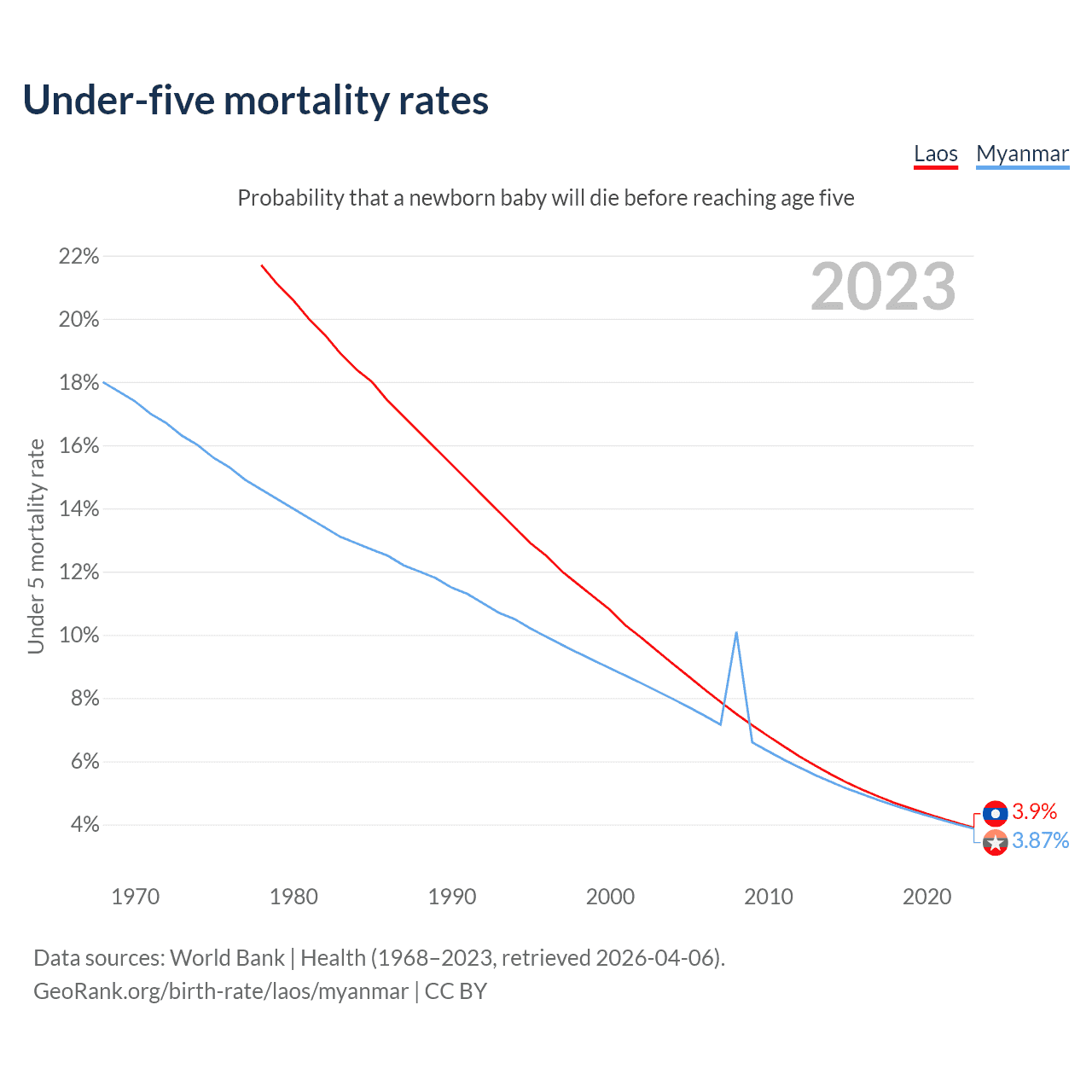 The chance that a newborn baby will die before reaching age five is 3.9% in Laos and 3.87% in Myanmar. Above is a chart with historical data on under-five mortality rates.