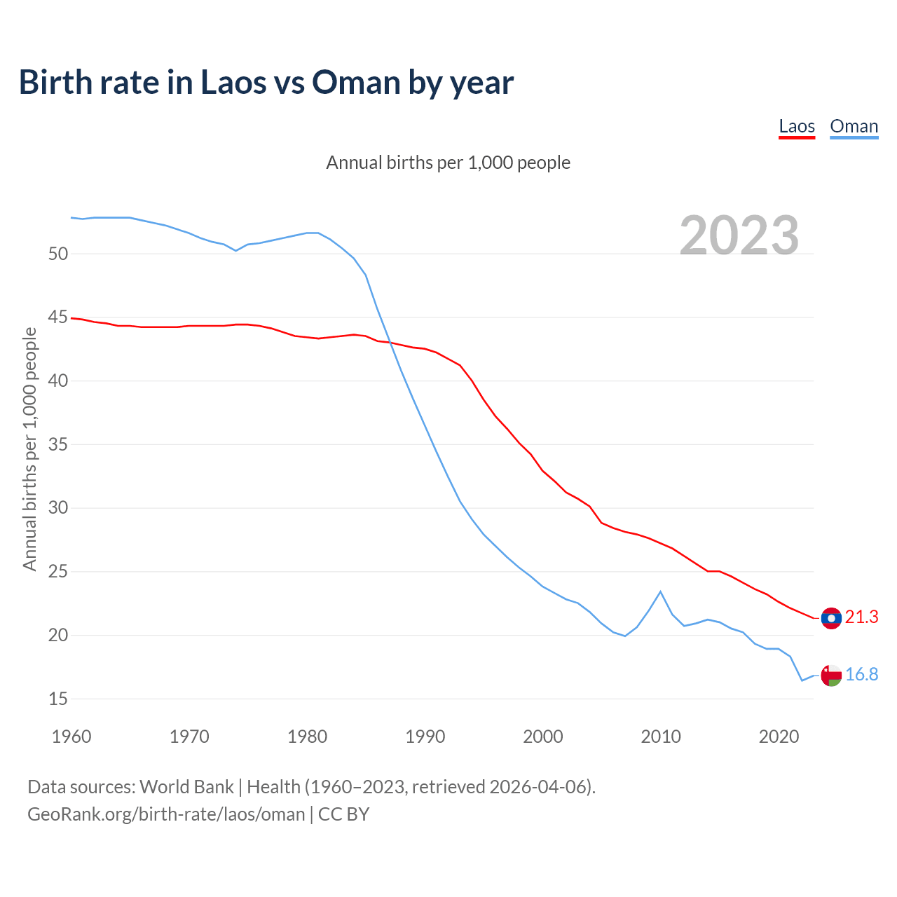 Laos has an annual birth rate of 21.3 births per 1,000 people, compared to 16.8 for Oman. The average number of children a woman is expected to have during her lifetime — the fertility rate, is 2.42 in Laos and 2.53 in Oman — 4.3% difference.