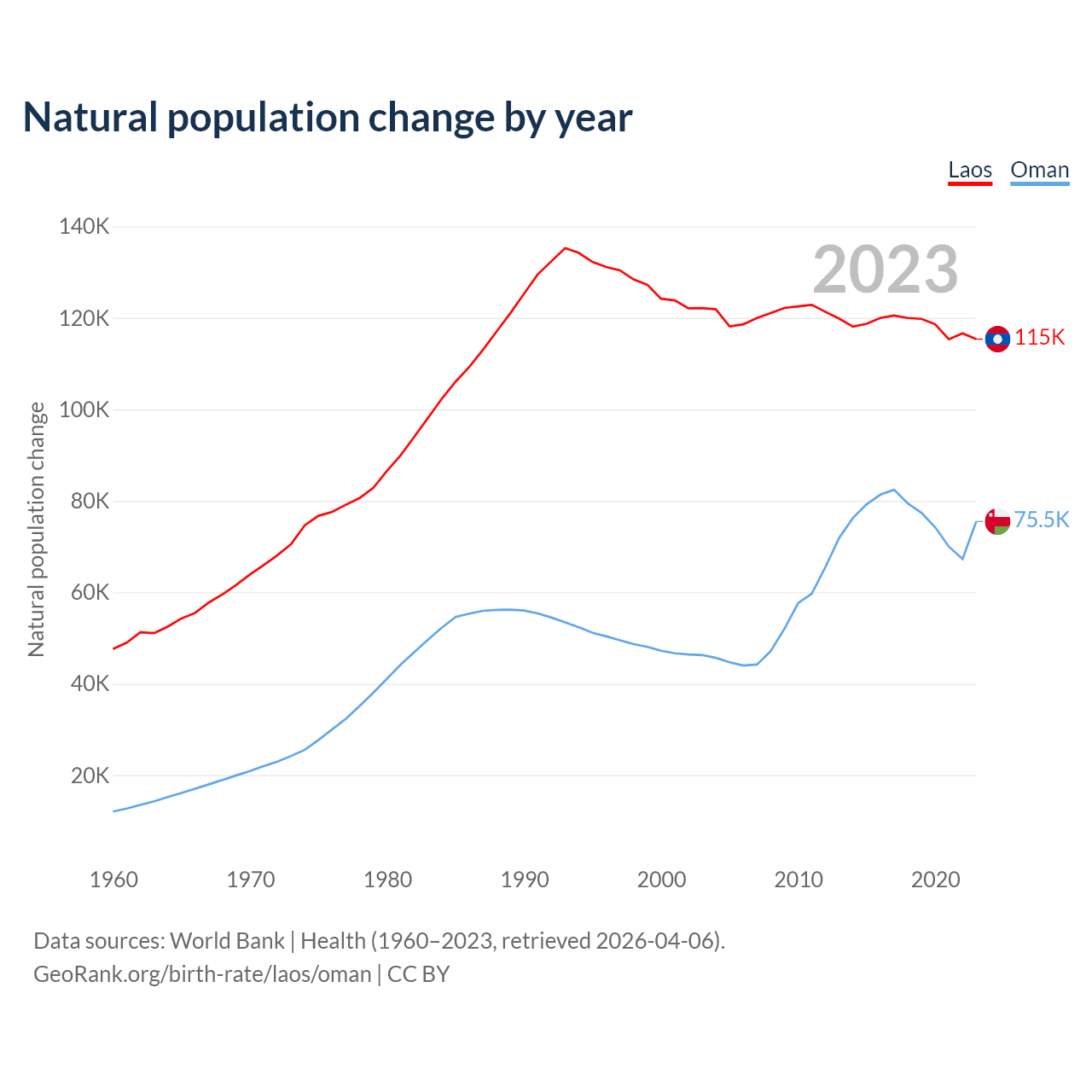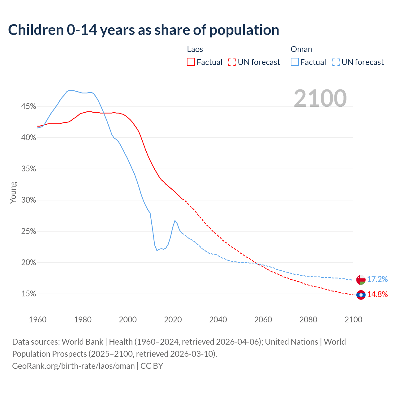 According to the latest available data on birth rates, the fertility rate in Laos was 2.42 children per woman in 2023, compared to 2.53 in Oman in 2023. The replacement level is considered to be 2.1 children per woman.