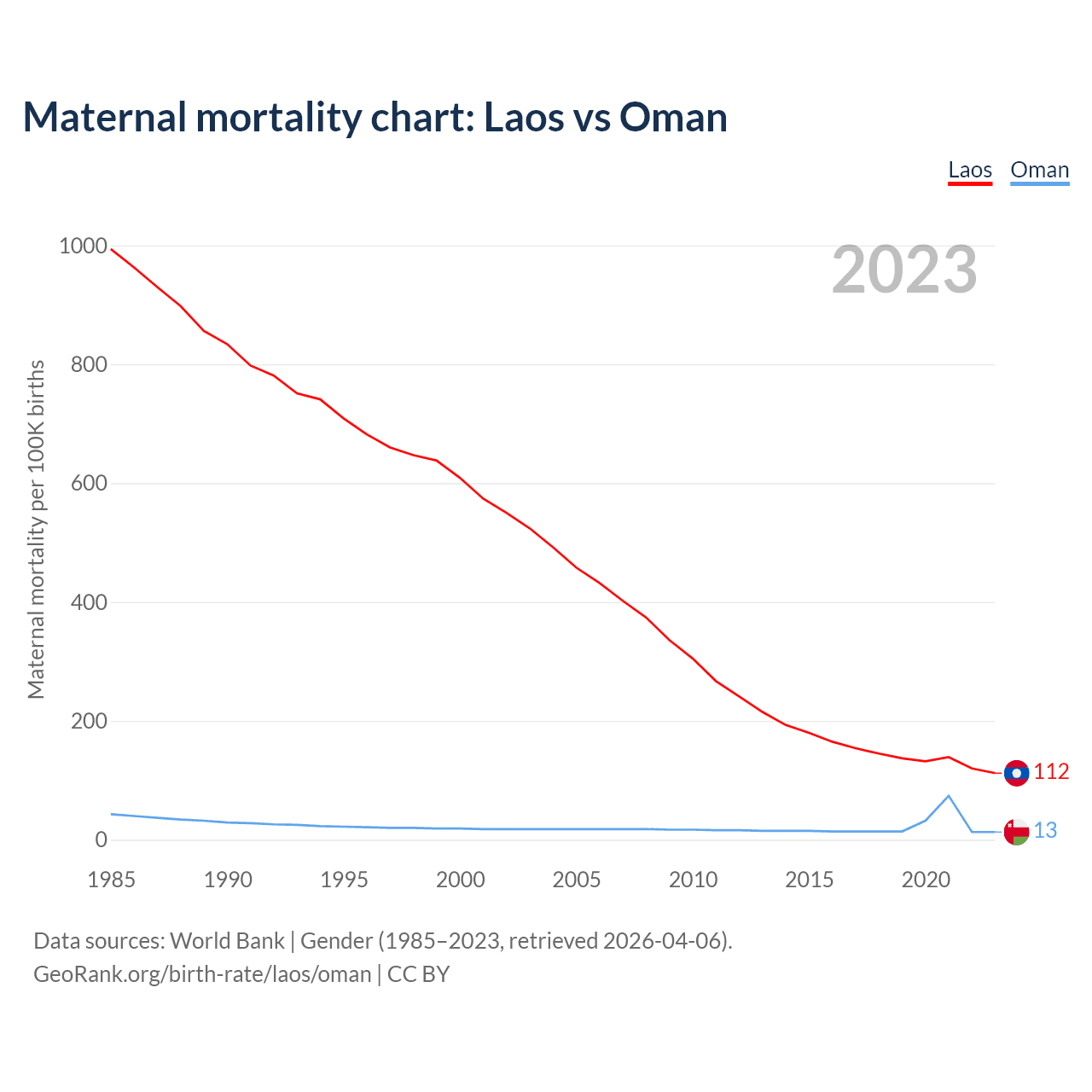 The maternal mortality rate, which is the probability of dying during childbirth or within 42 days of pregnancy termination, is 112 deaths per 100,000 live births in Laos, compared to 13 deaths in Oman.