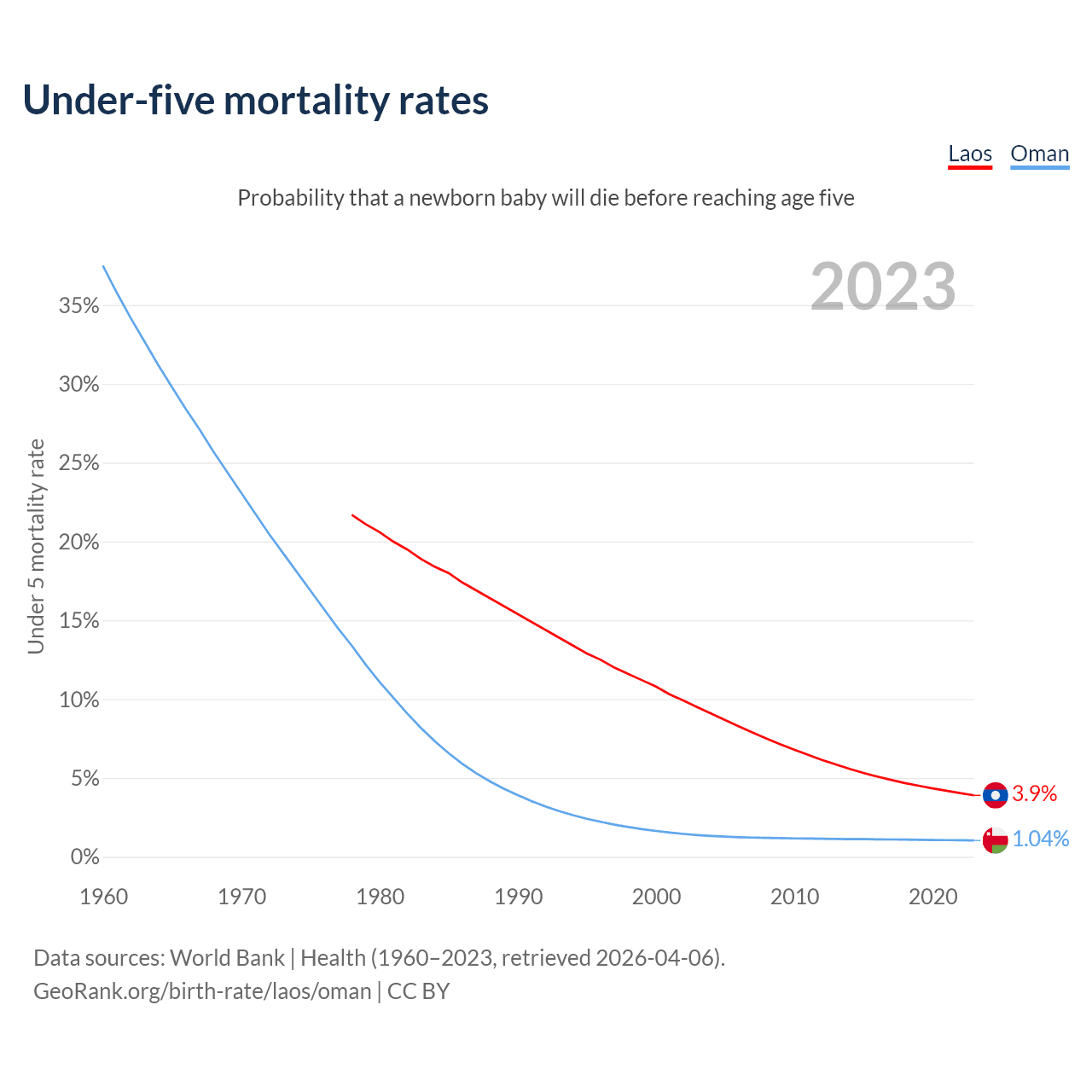 The chance that a newborn baby will die before reaching age five is 3.9% in Laos and 1.04% in Oman. Above is a chart with historical data on under-five mortality rates.