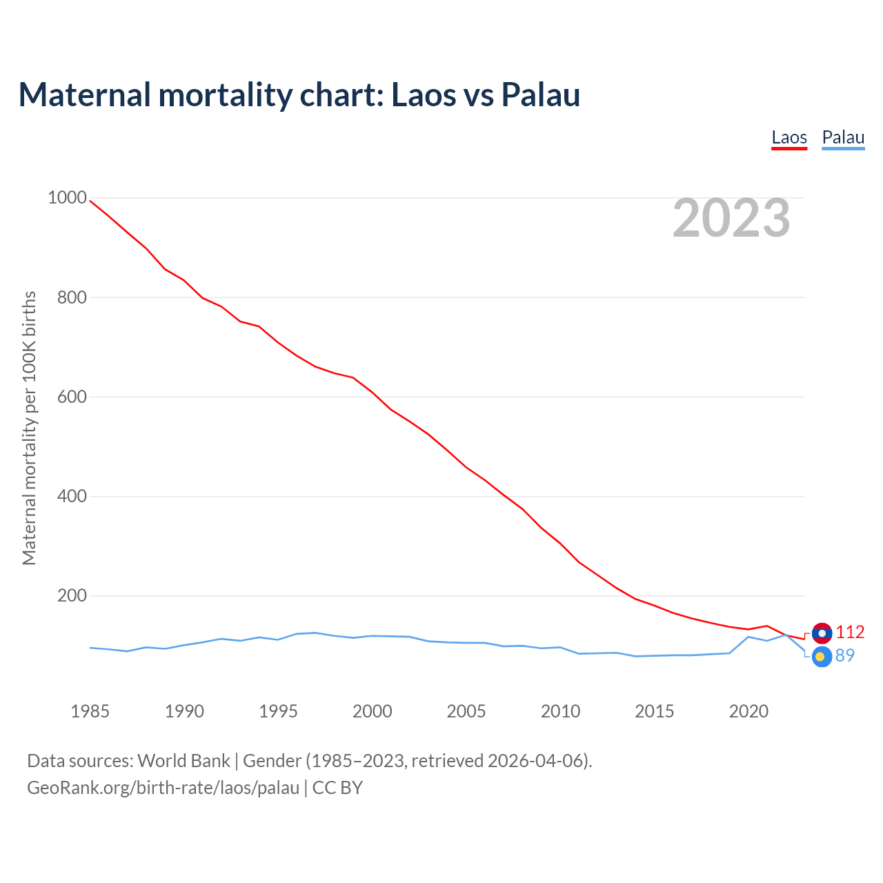 The maternal mortality rate, which is the probability of dying during childbirth or within 42 days of pregnancy termination, is 112 deaths per 100,000 live births in Laos, compared to 89 deaths in Palau.