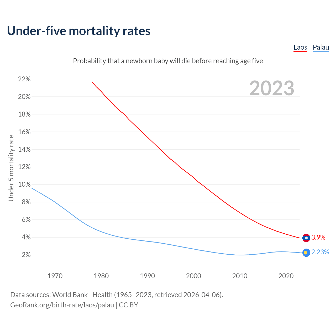 The chance that a newborn baby will die before reaching age five is 3.9% in Laos and 2.23% in Palau. Above is a chart with historical data on under-five mortality rates.