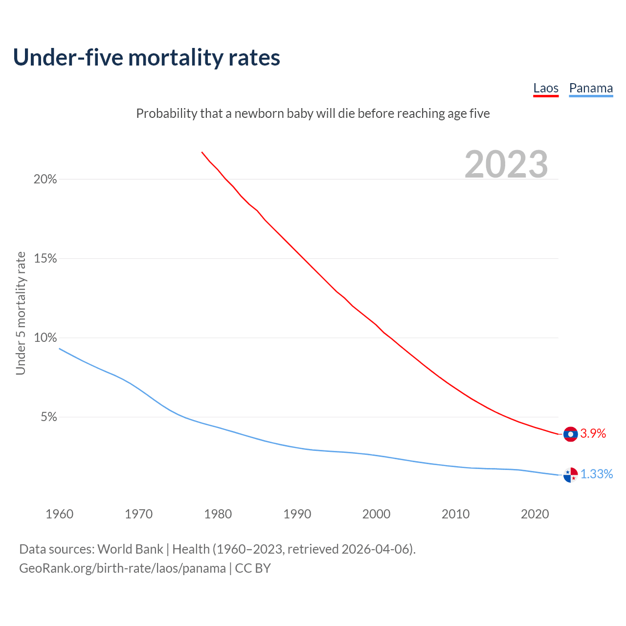 The chance that a newborn baby will die before reaching age five is 3.9% in Laos and 1.33% in Panama. Above is a chart with historical data on under-five mortality rates.
