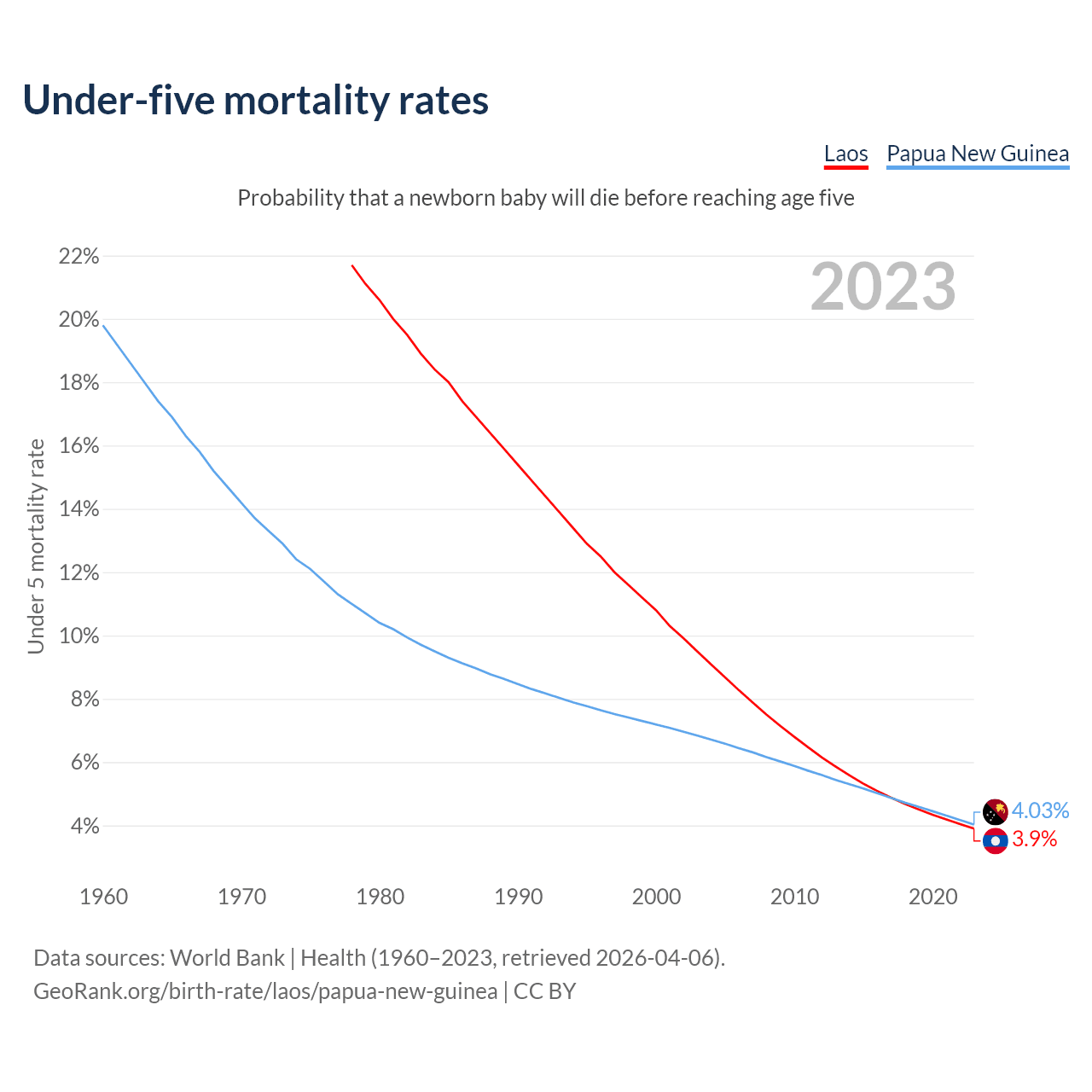 The chance that a newborn baby will die before reaching age five is 3.9% in Laos and 4.03% in Papua New Guinea. Above is a chart with historical data on under-five mortality rates.