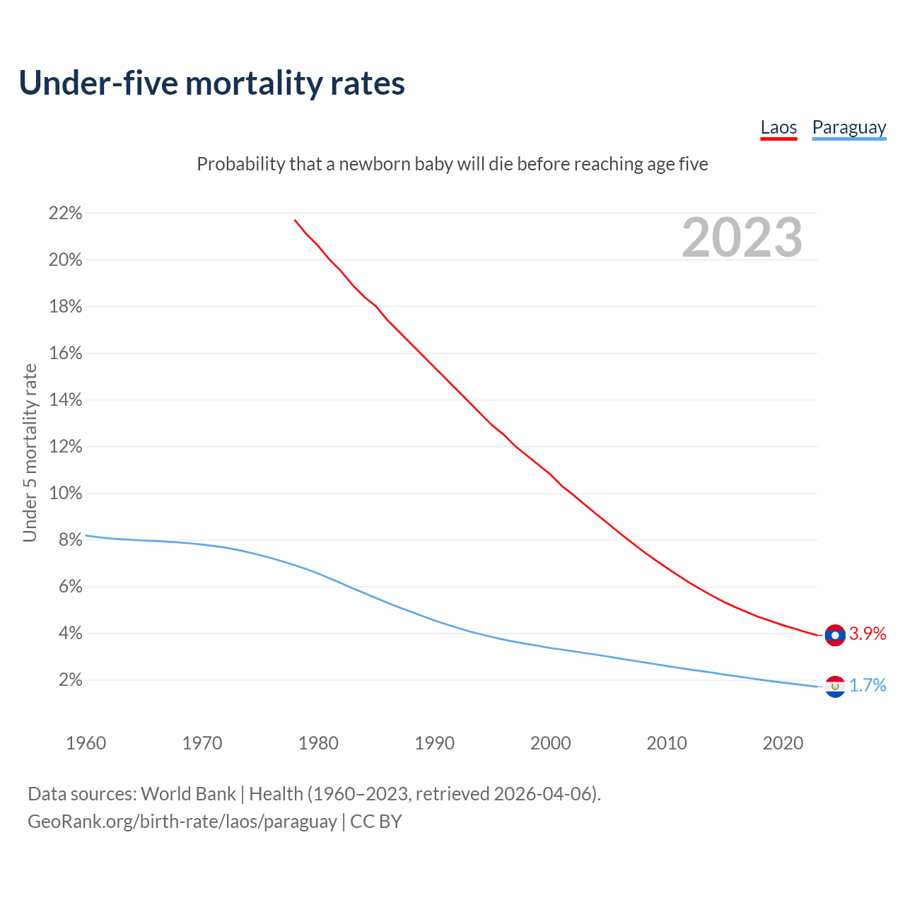 The chance that a newborn baby will die before reaching age five is 3.9% in Laos and 1.7% in Paraguay. Above is a chart with historical data on under-five mortality rates.